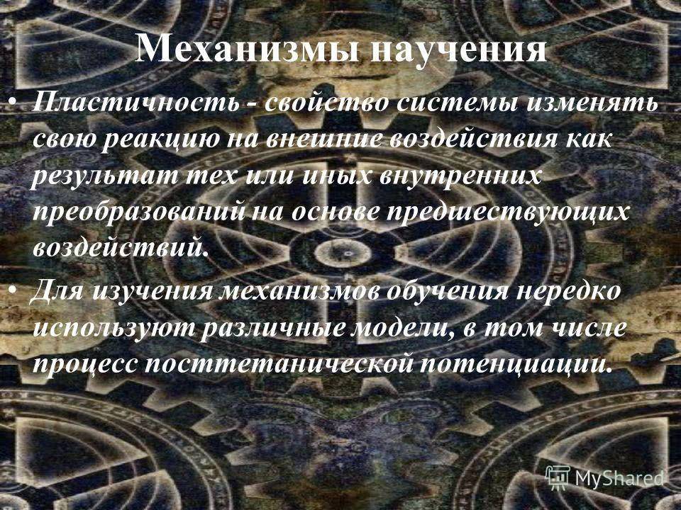 Механизмы научения Пластичность — свойство системы изменять свою реакцию на внешние воздействия как результат тех или иных внутренних преобразований на основе предшествующих воздействий. Для изучения механизмов обучения нередко используют различные модели, в том числе процесс посттетанической потенциации.