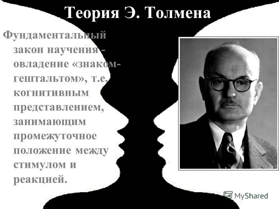 Теория Э. Толмена Фундаментальный закон научения — овладение «знаком- гештальтом», т.е. когнитивным представлением, занимающим промежуточное положение между стимулом и реакцией.