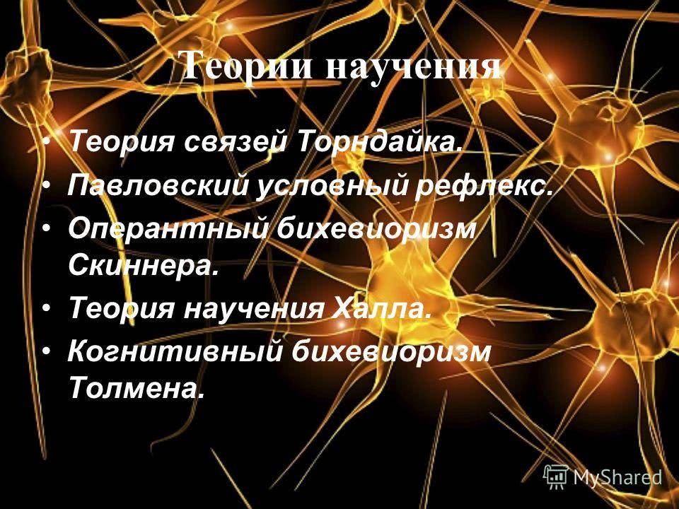 Теории научения Теория связей Торндайка. Павловский условный рефлекс. Оперантный бихевиоризм Скиннера. Теория научения Халла. Когнитивный бихевиоризм Толмена.