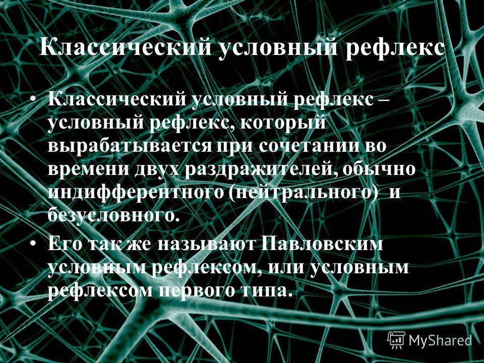Классический условный рефлекс Классический условный рефлекс – условный рефлекс, который вырабатывается при сочетании во времени двух раздражителей, обычно индифферентного (нейтрального) и безусловного. Его так же называют Павловским условным рефлексом, или условным рефлексом первого типа.