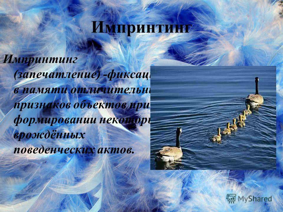 Импринтинг Импринтинг (запечатление) -фиксация в памяти отличительных признаков объектов при формировании некоторых врождённых поведенческих актов.