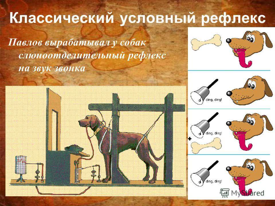 Классический условный рефлекс Павлов вырабатывал у собак слюноотделительный рефлекс на звук звонка