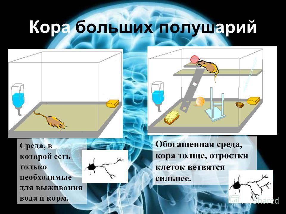Кора больших полушарий Среда, в которой есть только необходимые для выживания вода и корм. Обогащенная среда, кора толще, отростки клеток ветвятся сильнее.