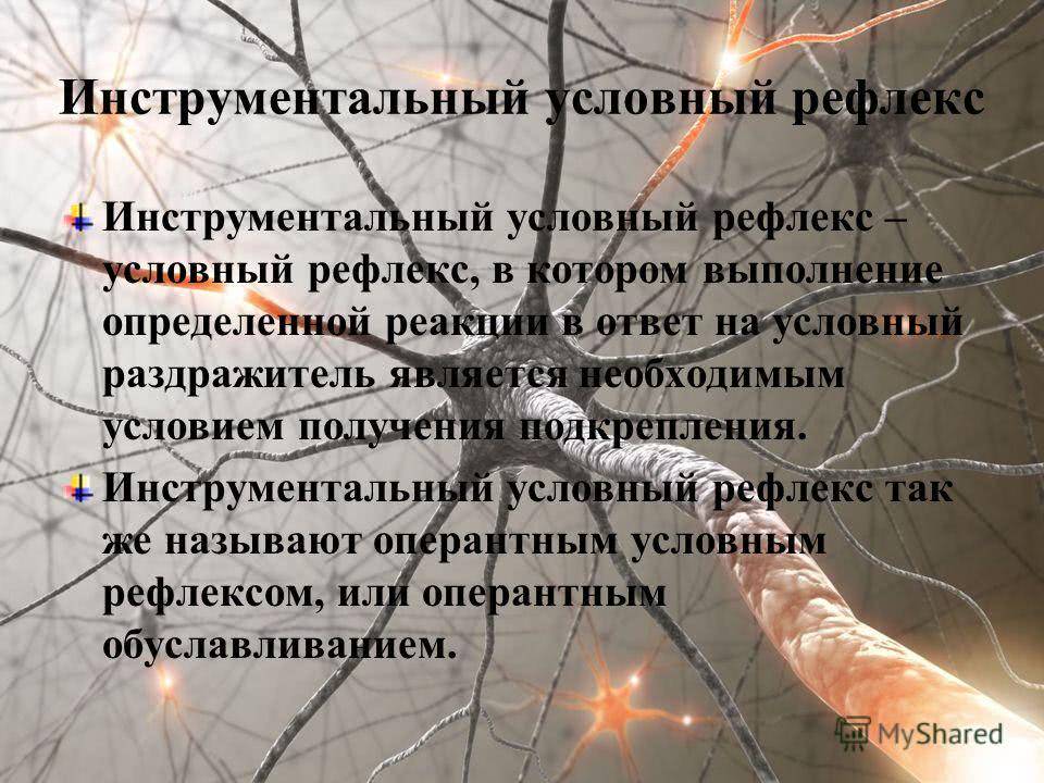 Инструментальный условный рефлекс Инструментальный условный рефлекс – условный рефлекс, в котором выполнение определенной реакции в ответ на условный раздражитель является необходимым условием получения подкрепления. Инструментальный условный рефлекс так же называют оперантным условным рефлексом, или оперантным обуславливанием.