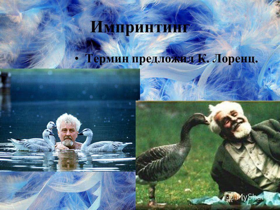 Импринтинг (автор термина К. Лоренц) — «запечатление» объекта инстинктивного поведения (напр., при инстинктивной реакции следования). Некое инстинктивное поведение запускается «ключевым раздражителем», однако сам этот раздражитель заранее конкретно не определен, и зависит от наличных условий. Последствия импринтинга необратимы.