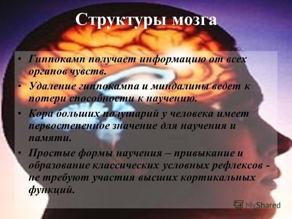 Структуры мозга Гиппокамп получает информацию от всех органов чувств. Удаление гиппокампа и миндалины ведет к потери способности к научению. Кора больших полушарий у человека имеет первостепенное значение для научения и памяти. Простые формы научения – привыкание и образование классических условных рефлексов — не требуют участия высших кортикальных функций.