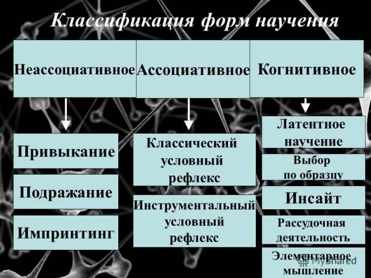 Классификация форм научения Неассоциативное Когнитивное Ассоциативное Привыкание Подражание Импринтинг Инструментальный условный рефлекс Классический условный рефлекс Элементарное мышление Рассудочная деятельность Инсайт Выбор по образцу Латентное научение