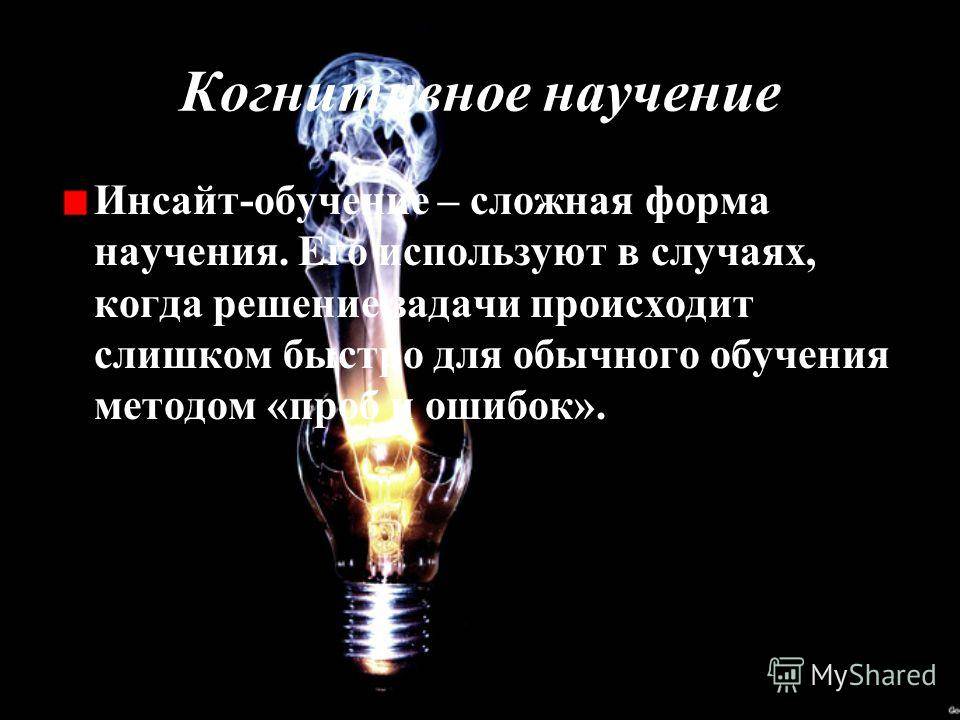 Когнитивное научение Инсайт-обучение – сложная форма научения. Его используют в случаях, когда решение задачи происходит слишком быстро для обычного обучения методом «проб и ошибок».