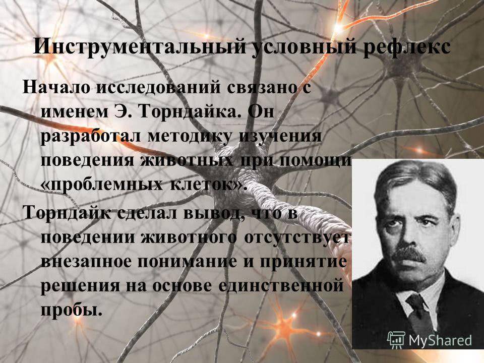 Инструментальный условный рефлекс Начало исследований связано с именем Э. Торндайка. Он разработал методику изучения поведения животных при помощи «проблемных клеток». Торндайк сделал вывод, что в поведении животного отсутствует внезапное понимание и принятие решения на основе единственной пробы.