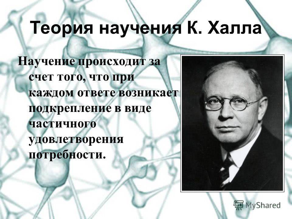 Теория научения К. Халла Научение происходит за счет того, что при каждом ответе возникает подкрепление в виде частичного удовлетворения потребности.