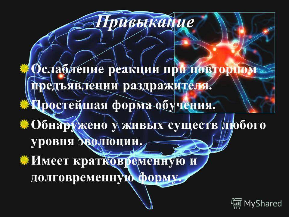 Привыкание Ослабление реакции при повторном предъявлении раздражителя. Простейшая форма обучения. Обнаружено у живых существ любого уровня эволюции. Имеет кратковременную и долговременную форму.