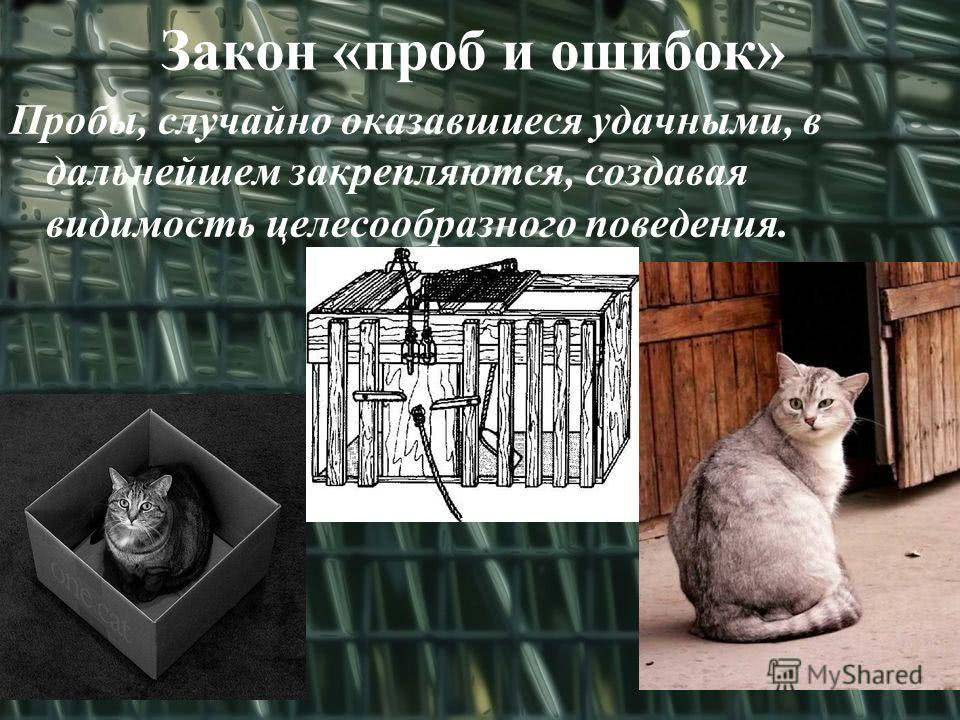 Закон «проб и ошибок» Пробы, случайно оказавшиеся удачными, в дальнейшем закрепляются, создавая видимость целесообразного поведения.