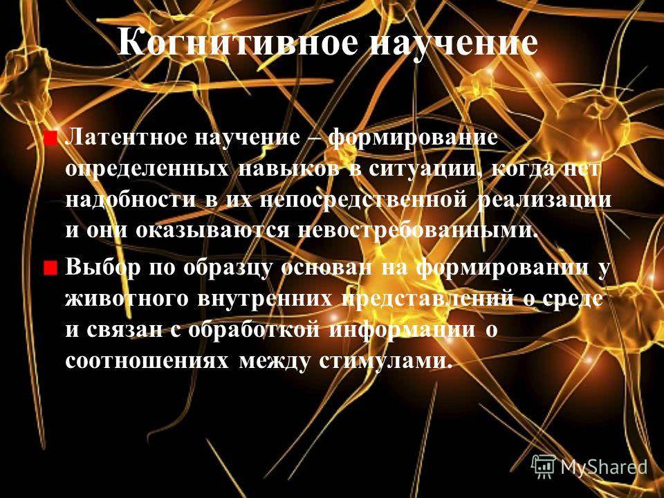 Когнитивное научение Латентное научение – формирование определенных навыков в ситуации, когда нет надобности в их непосредственной реализации и они оказываются невостребованными. Выбор по образцу основан на формировании у животного внутренних представлений о среде и связан с обработкой информации о соотношениях между стимулами.