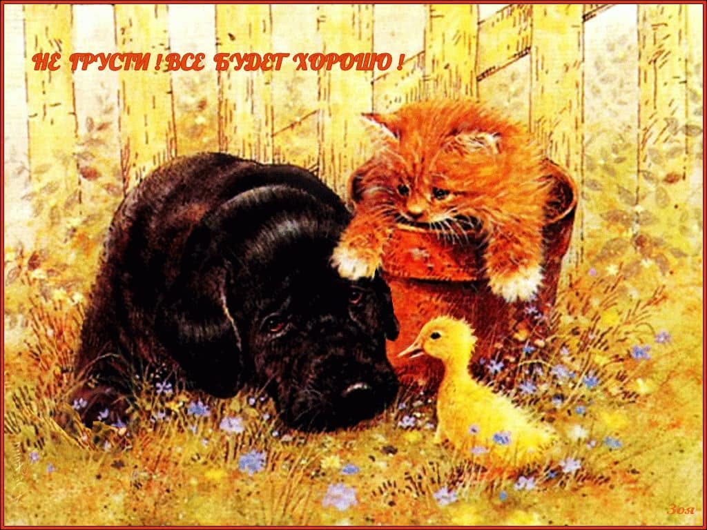 Котик и утёнок успокаивают грустящего щенка. А он напрасно грустит, ведь всё будет хорошо!