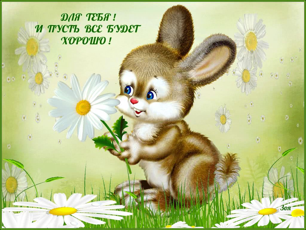 Гифка с зайчиком, дарящим цветок. Надпись «Для тебя! И пусть всё будет хорошо!»
