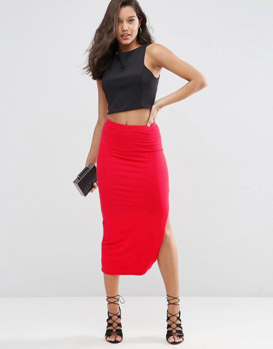 Красная миди юбка – оригинальный вариант. Если девушка может похвастаться длинными красивыми ногами, длина юбки может быть выше колена. В остальных случаях лучше надеть модели немного ниже колена. Фасон может быть любым, но наиболее актуальным остается карандаш.