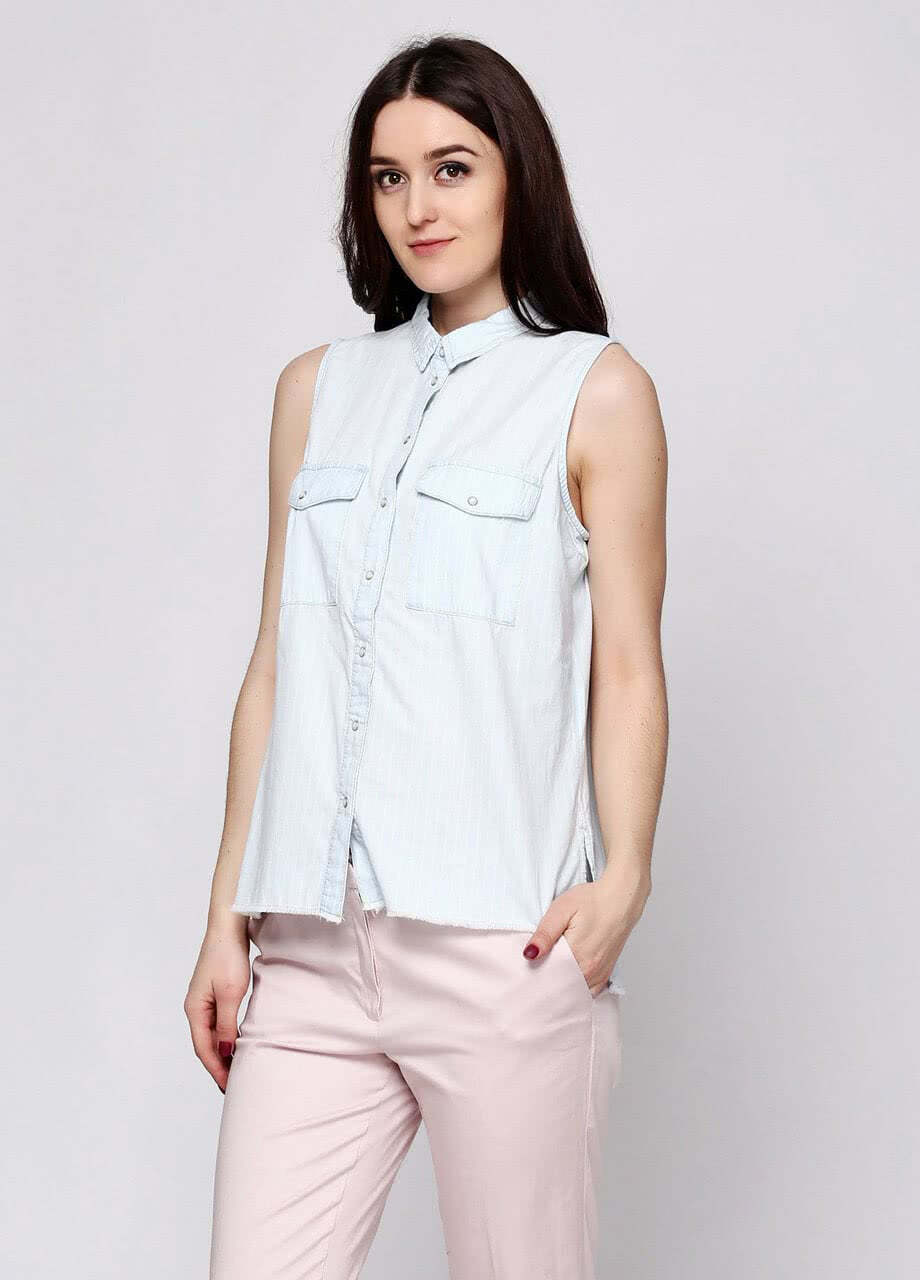Голубая рубашка в свободном стиле органично выглядит в сочетании с холодным цветотипом. Легкий загар и естественный макияж – все, что нужно для завершения стильного лука.