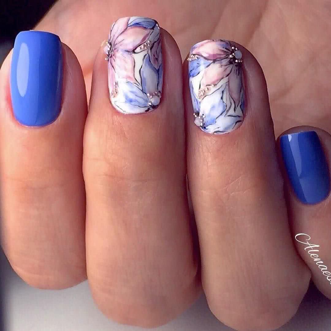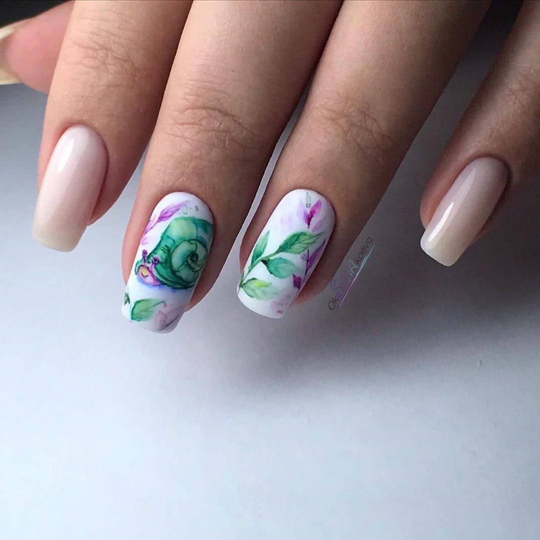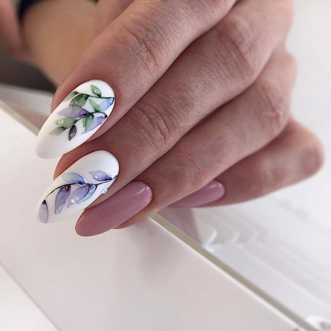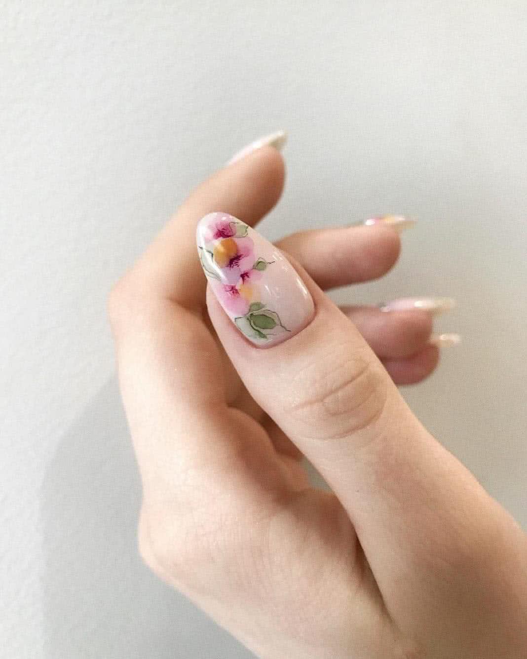 Маникюр акварельными красками смотрится невероятно нежно и воздушно. Благодаря использованию специальной акварели рисунок получается легким и полупрозрачным с эффектом градиента. На фото ниже вы можете видеть пример такого стильного и нежного нейл-арта.