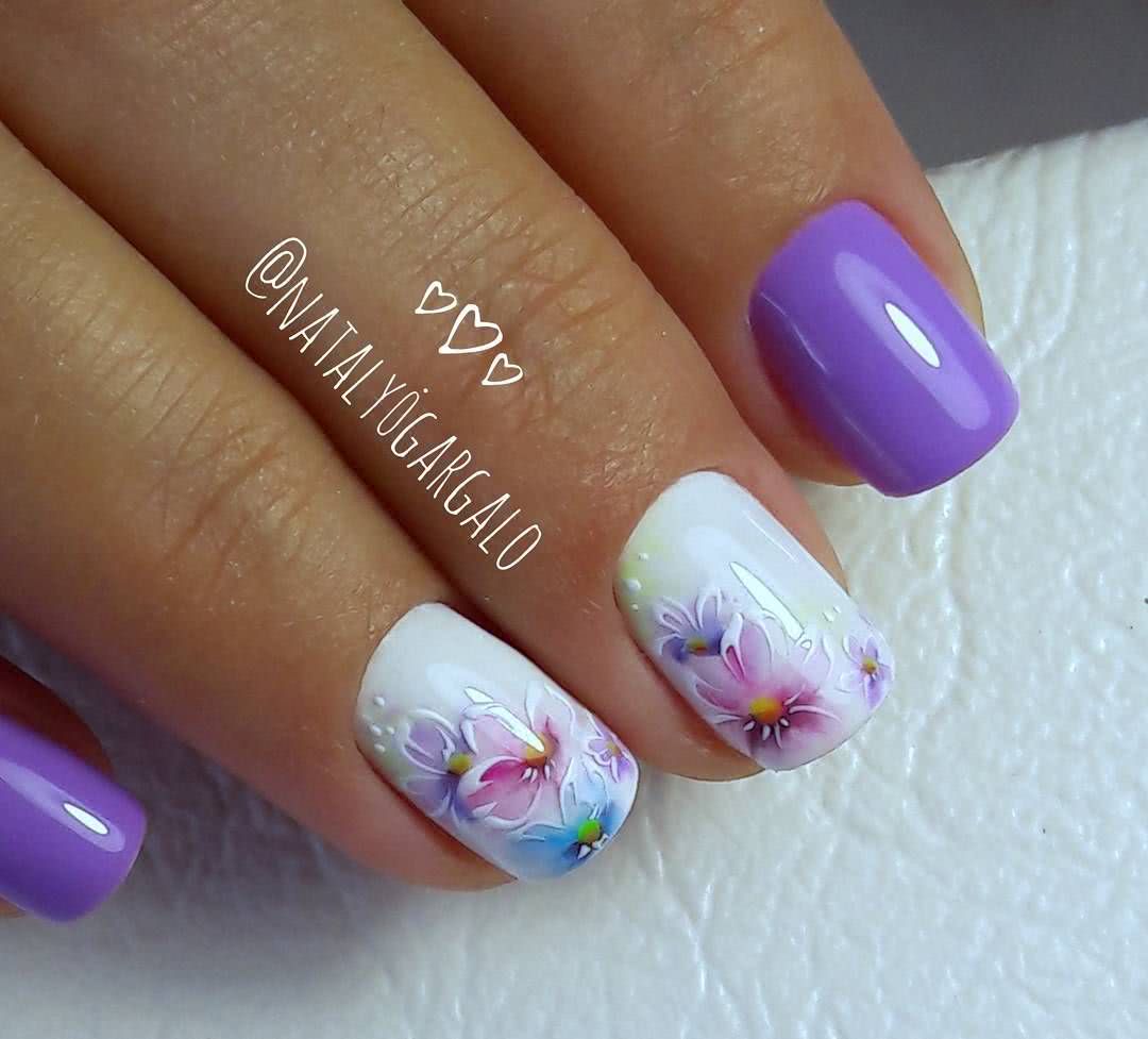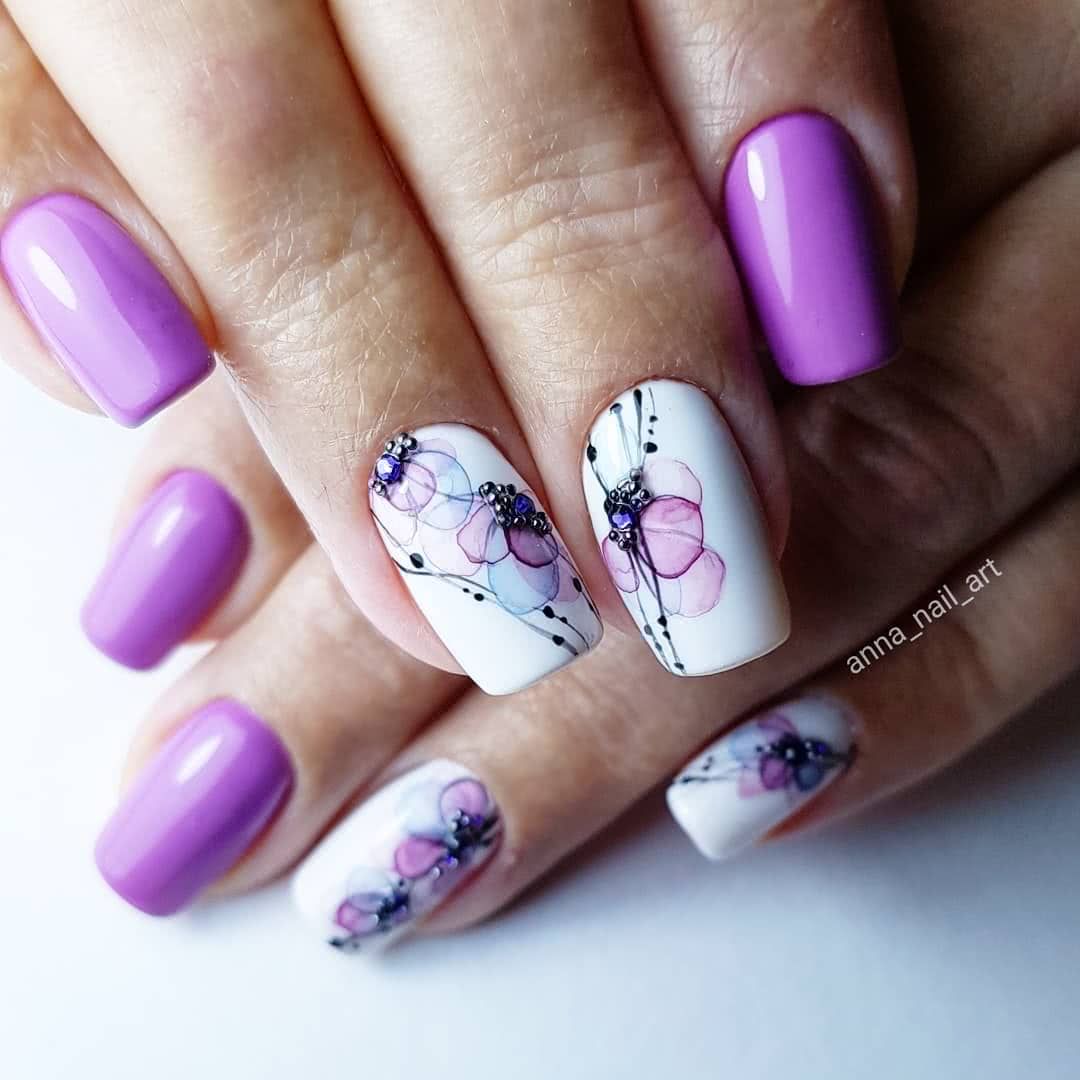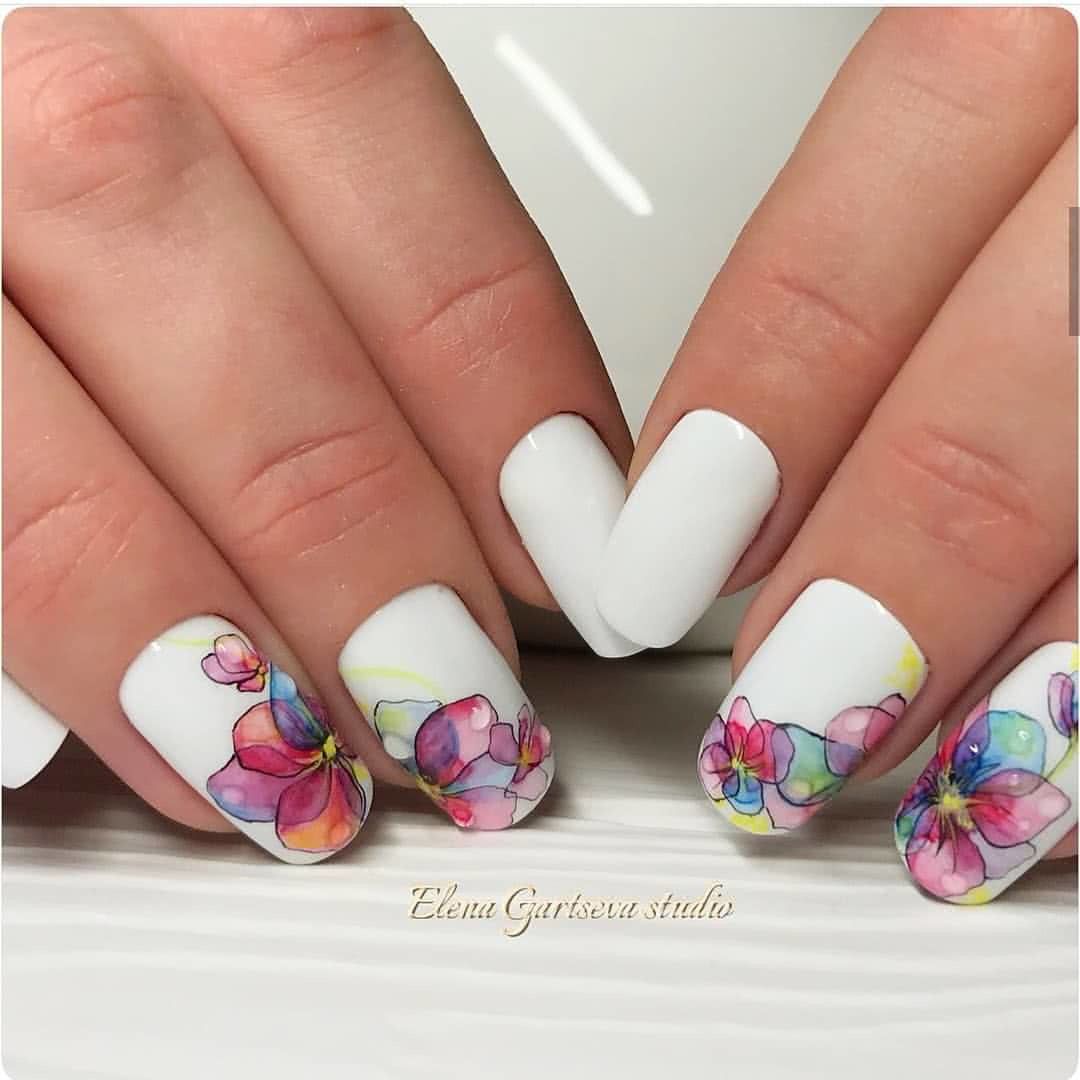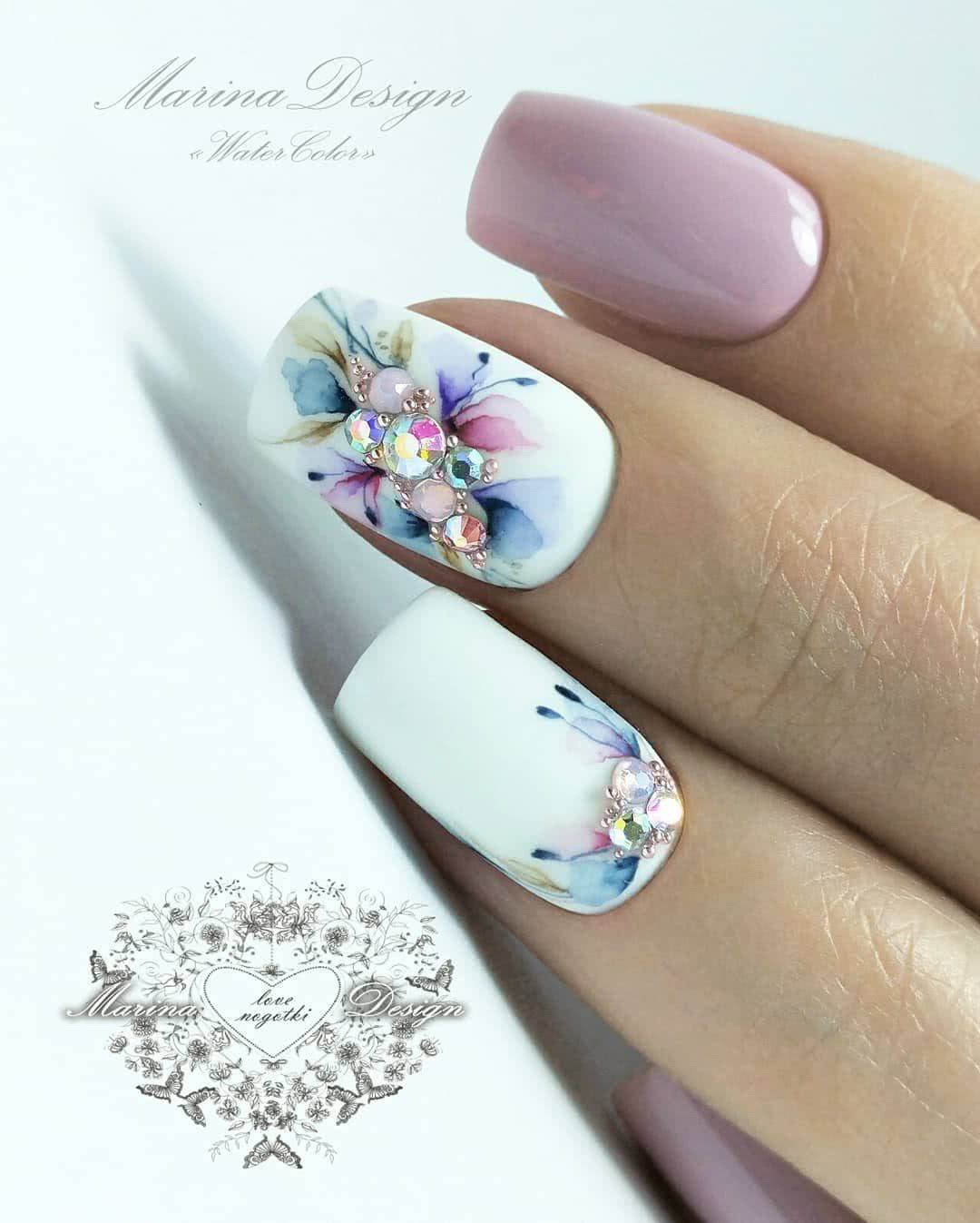 Работать с акварелью умеют не все мастера, поэтому если вы решили выполнить такой дизайн, заранее поинтересуйтесь у мастера о его опыте. Акварельный маникюр выполняется в светлых тонах, главным из которых является белый. На белом фоне цветы смотрятся очень мягко и сдержанно. Для изображения цветов используется фиолетовый и розовый цвета с многочисленными полутонами.