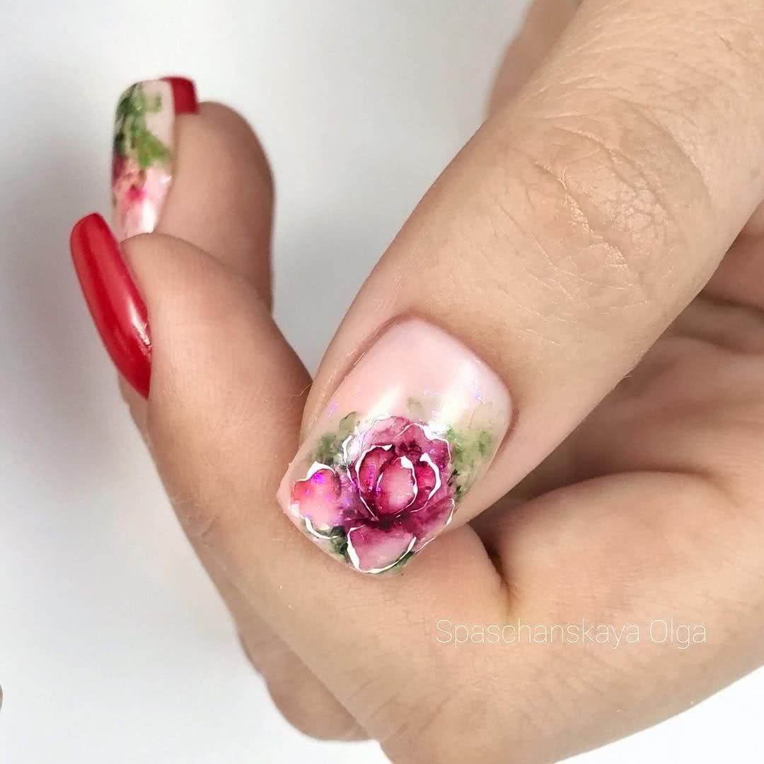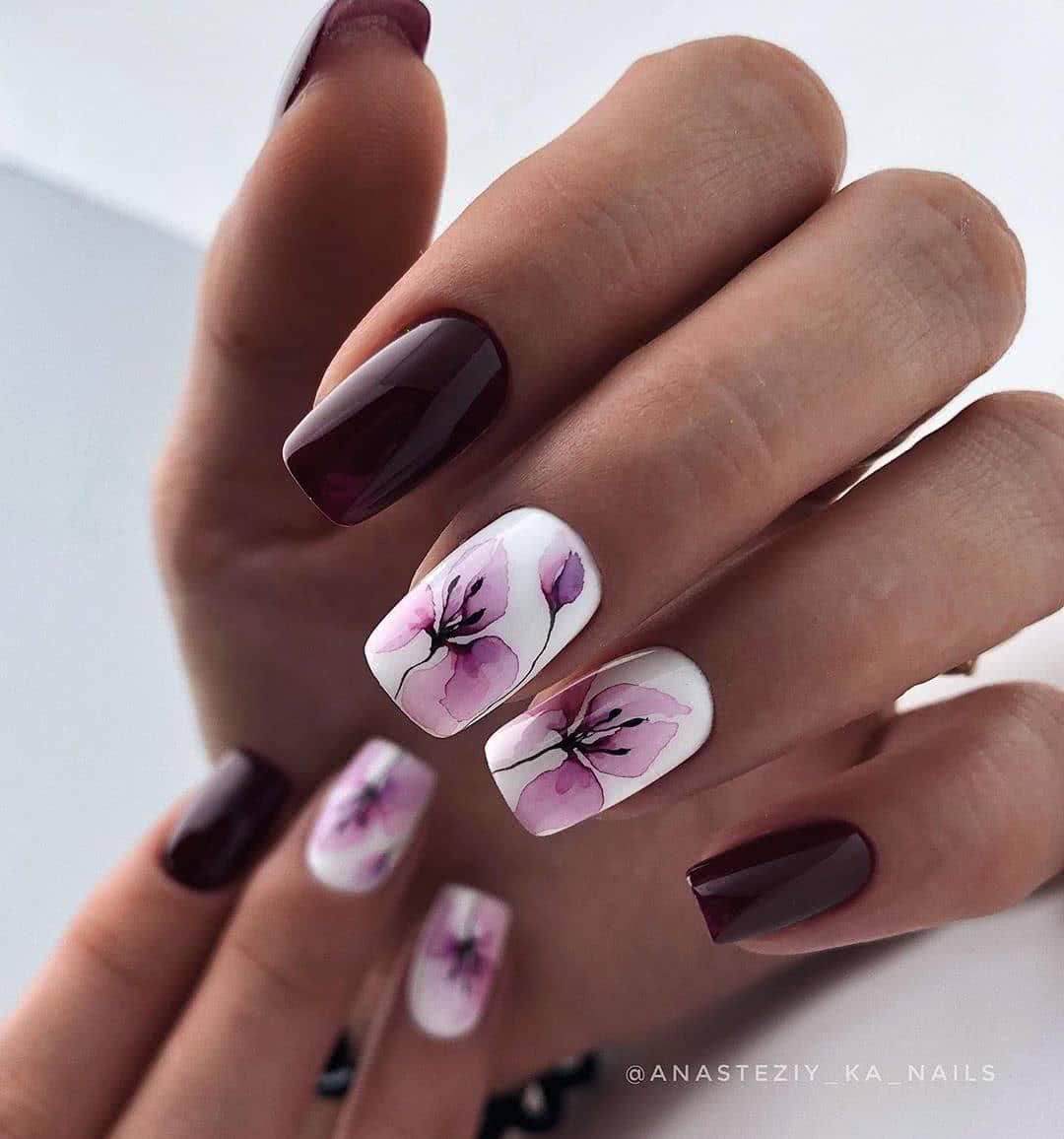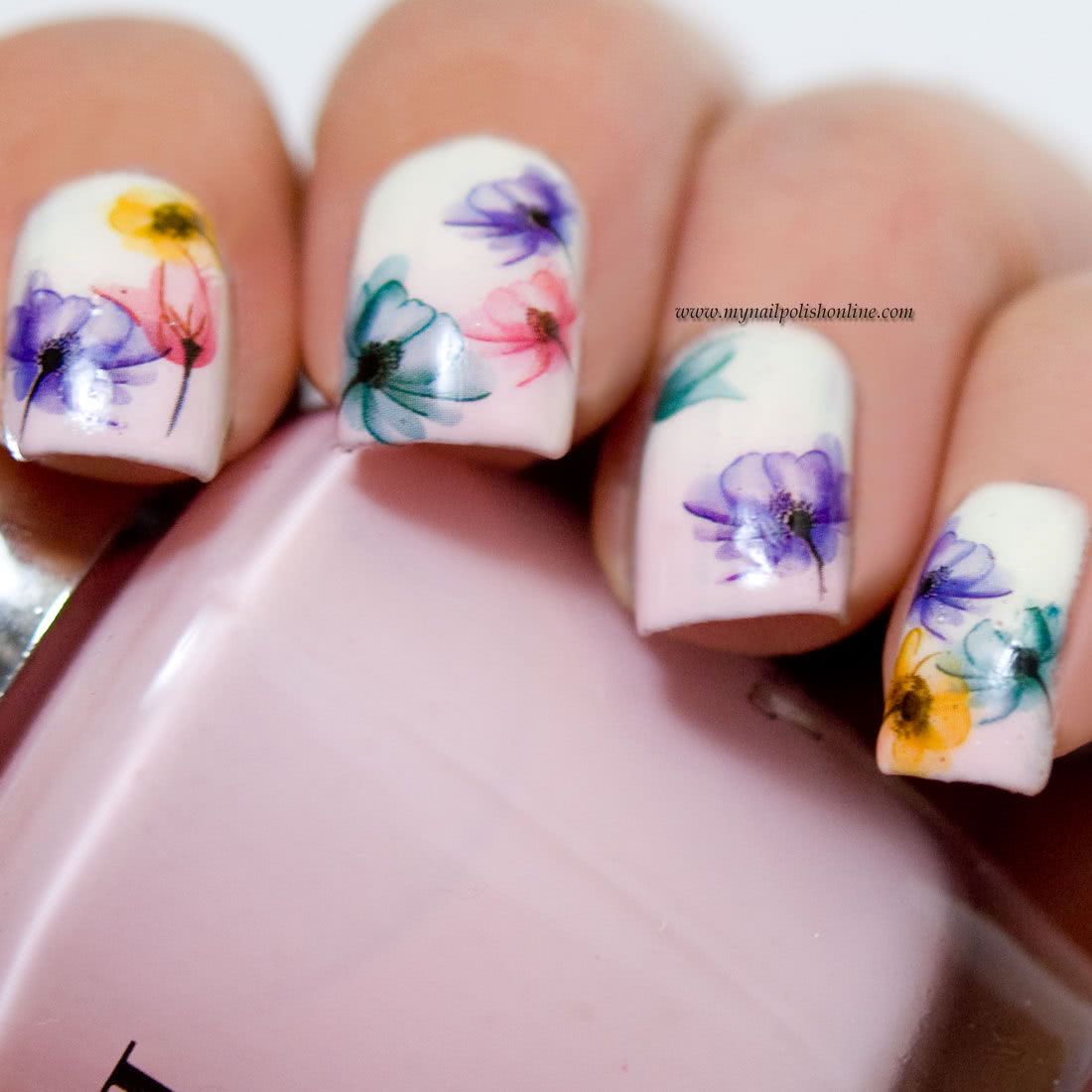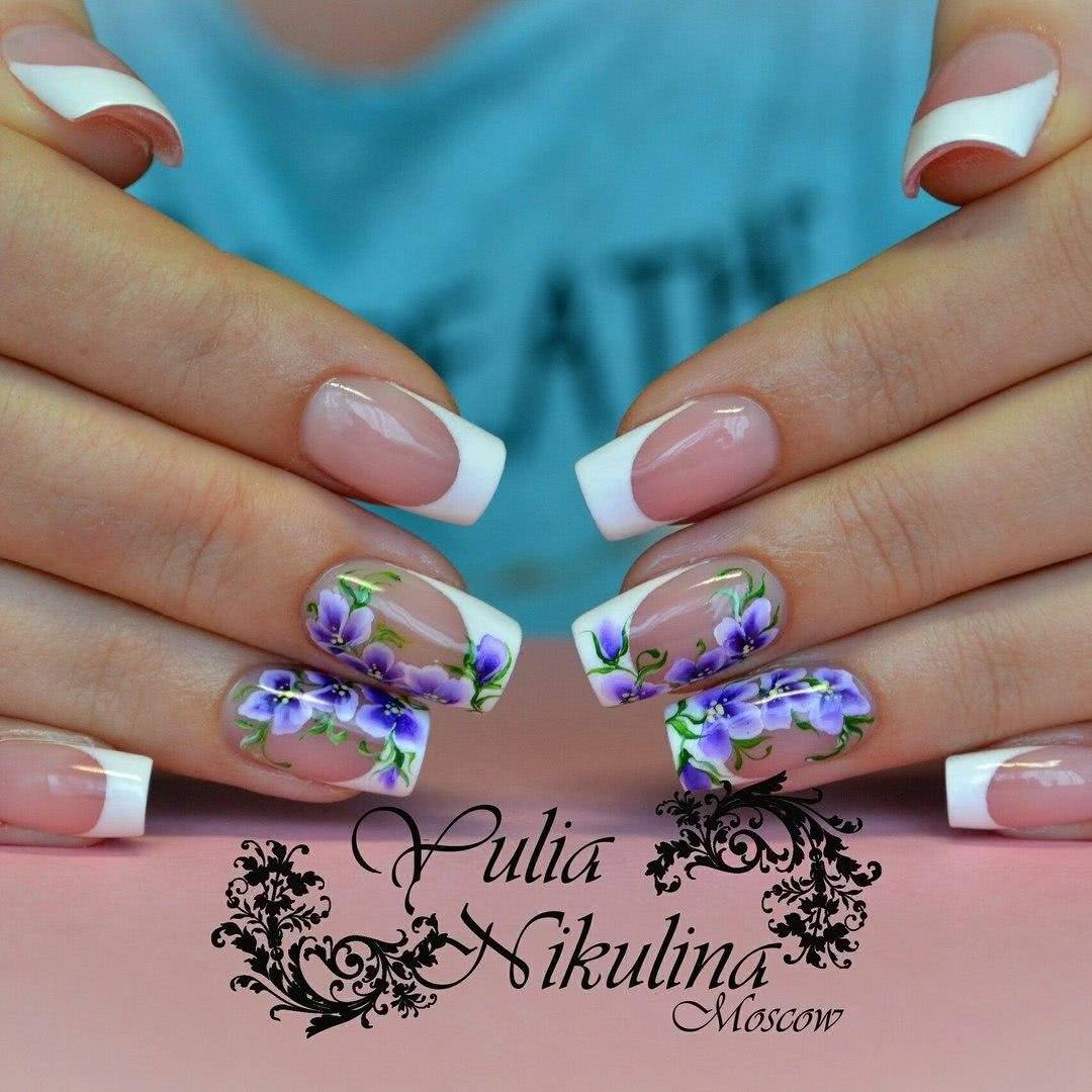 Работать с акварелью умеют не все мастера, поэтому если вы решили выполнить такой дизайн, заранее поинтересуйтесь у мастера о его опыте. Акварельный маникюр выполняется в светлых тонах, главным из которых является белый. На белом фоне цветы смотрятся очень мягко и сдержанно. Для изображения цветов используется фиолетовый и розовый цвета с многочисленными полутонами.