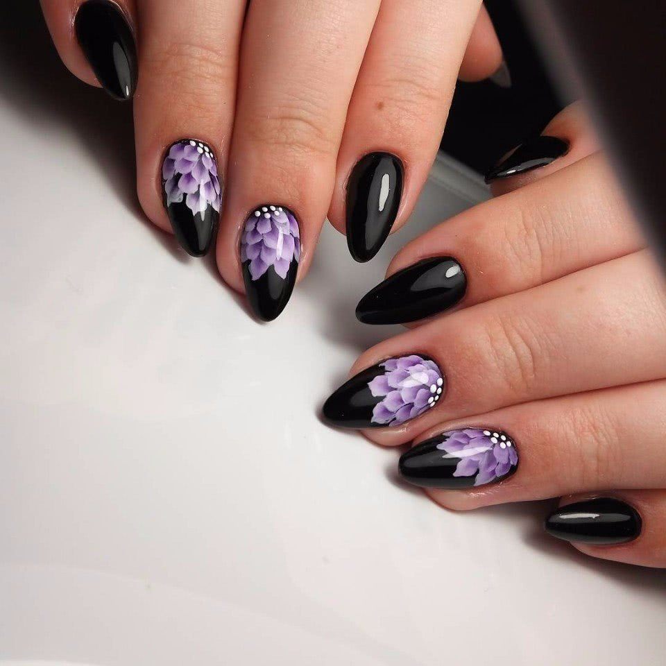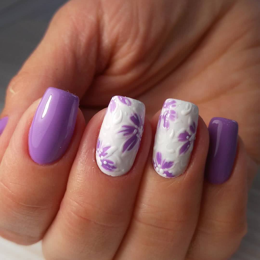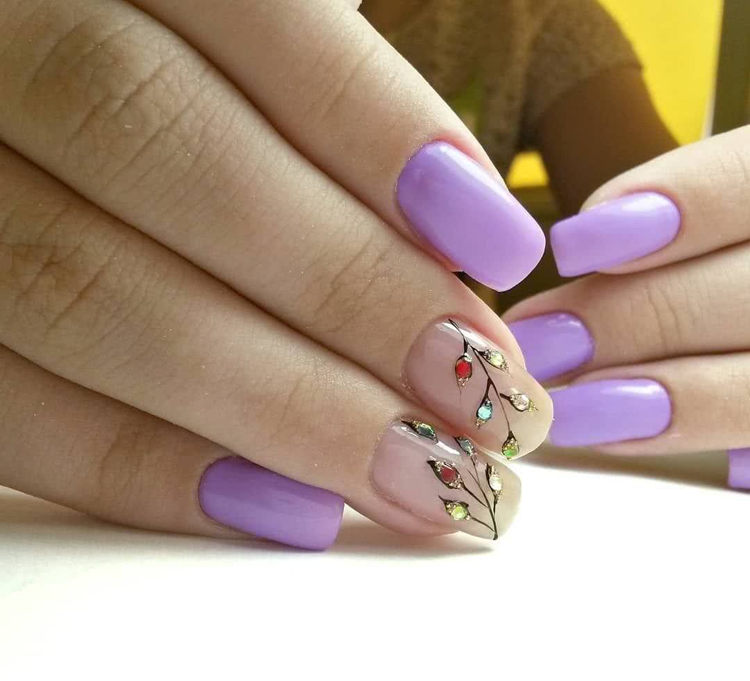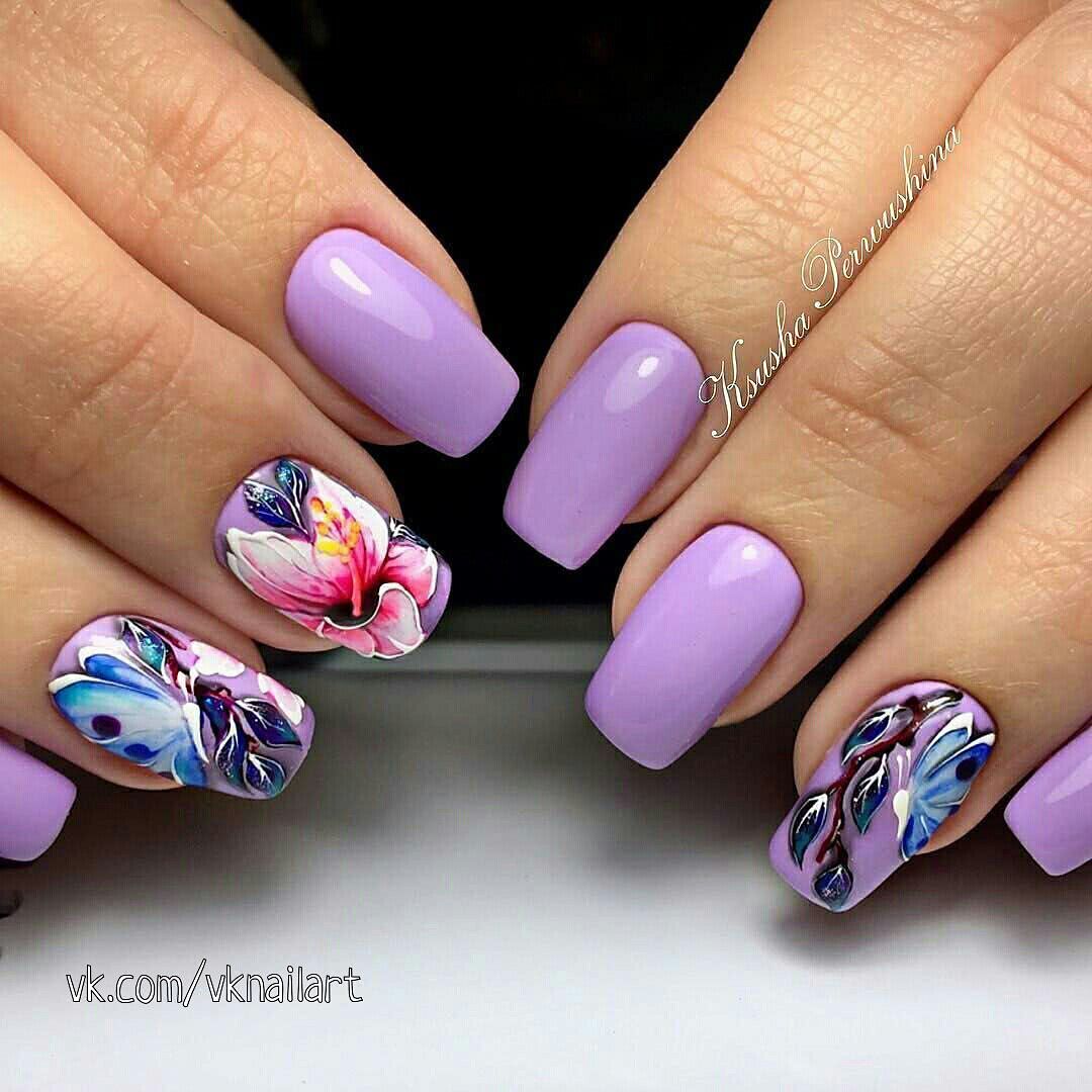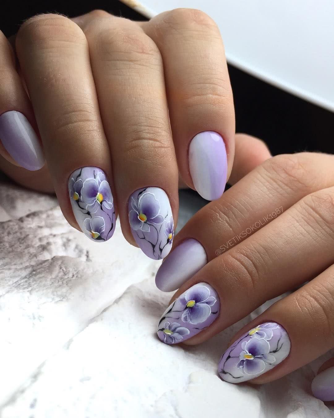 Полевые цветы смотрятся на ногтях очень нежно и легко. Воздушные лепестки и бутоны отлично гармонируют со светлым фоном, с матовой текстурой, с яркими тонами, например, фиолетовым или оранжевым.