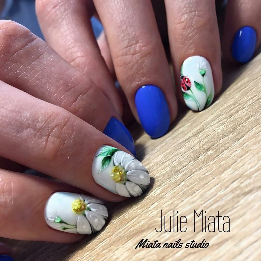 Разнообразие полевых цветов огромно, поэтому у вас будет из чего выбрать при создании этого дизайна. Для создания маникюра также лучше использовать слайдеры. Они могут быть на прозрачной или белой основе. Часто слайдеры дополнены другими элементами, например, бабочками, сердечками. Дизайн с полевыми цветами станет отличным решением для весеннего и летнего образа. Маникюр с мелкими и воздушными цветами позволит отдохнуть от сложных насыщенных нейл-артов.