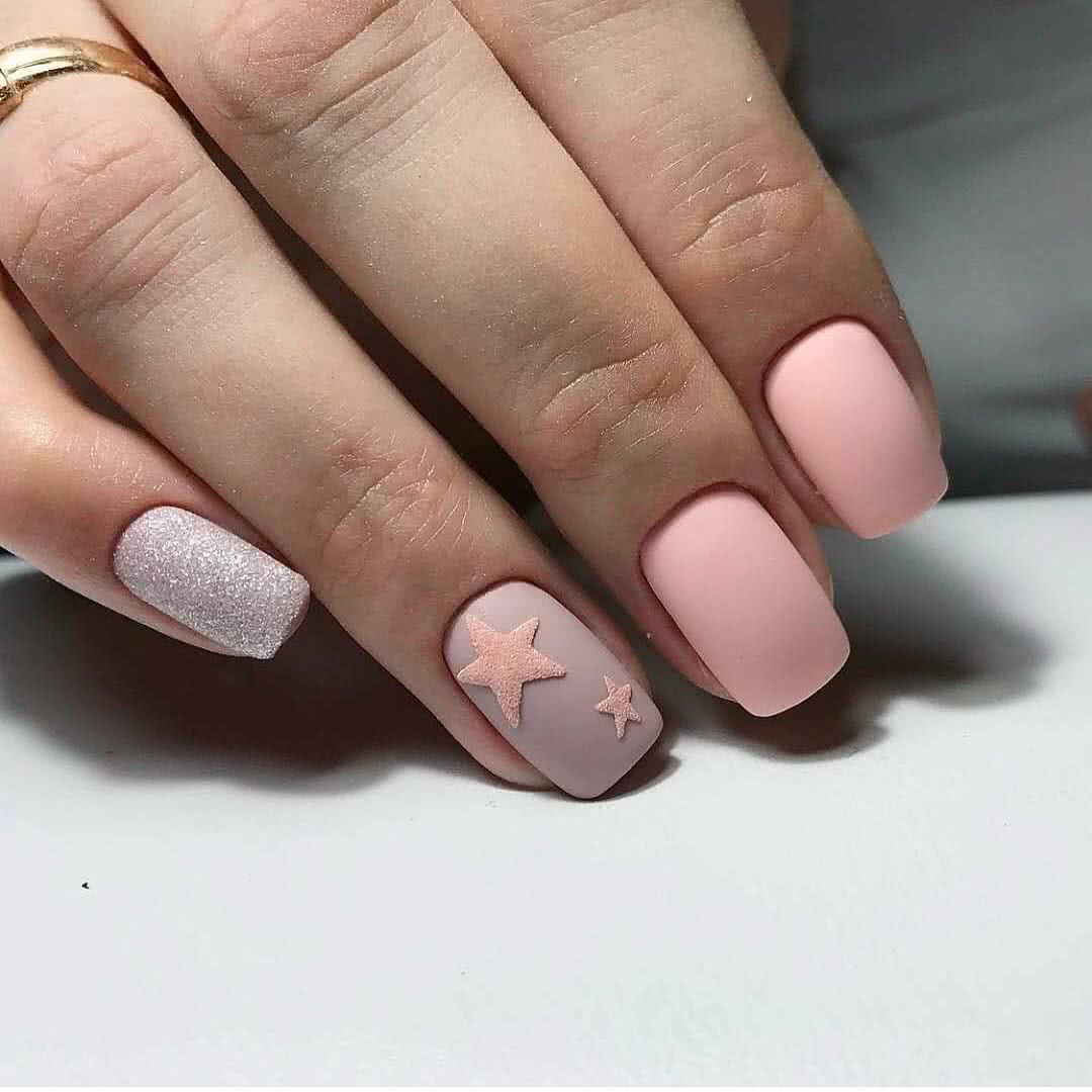 Маникюр минимализм в светлых тонах особенно красиво смотрится в матовом исполнении. Используйте декор глянцевыми гель-лаками, глиттером, слайдерами с надписями, стемпингом. Что касается стразов, то их количество также стоит уменьшить. Одного-двух камушков будет достаточно, чтобы внести яркость в весь дизайн.