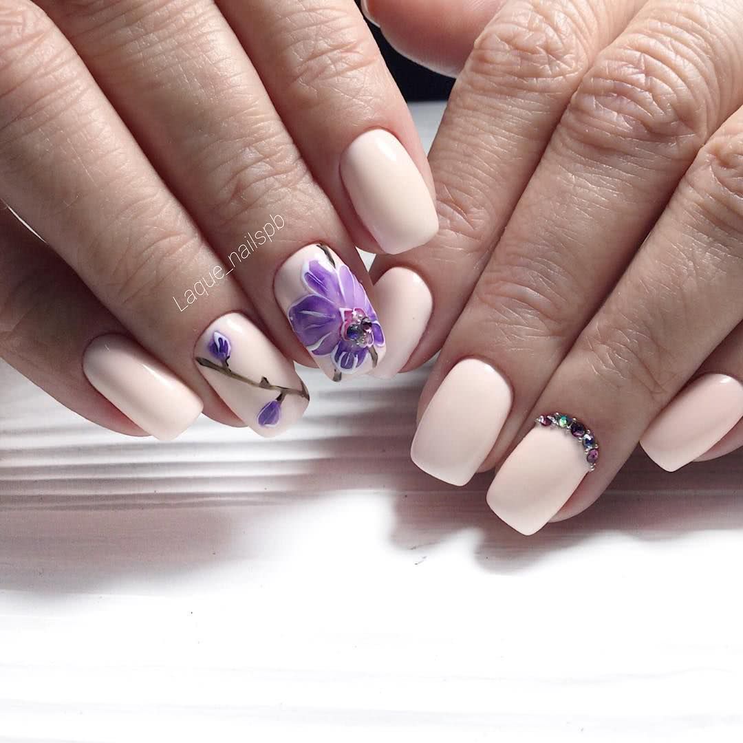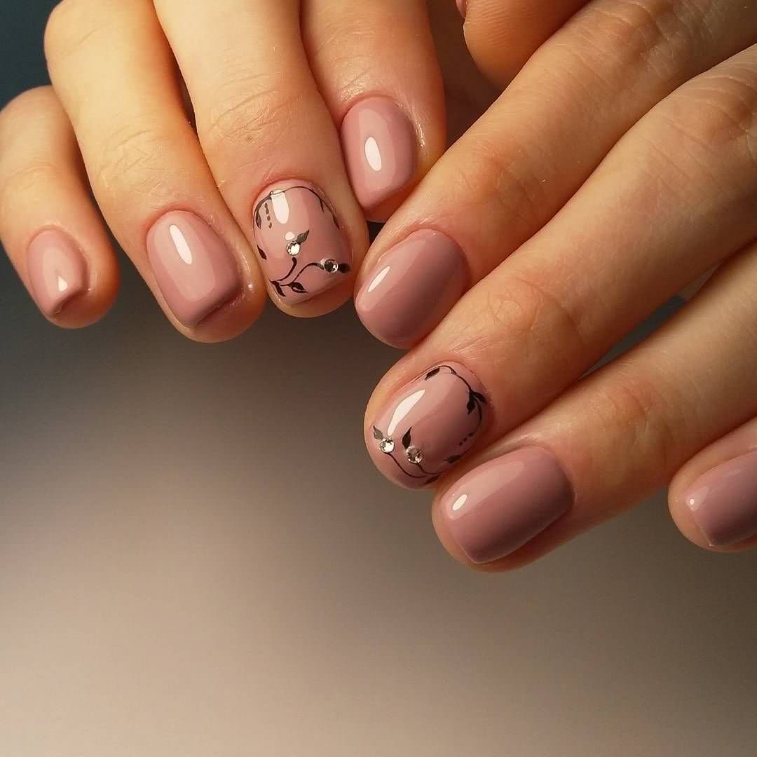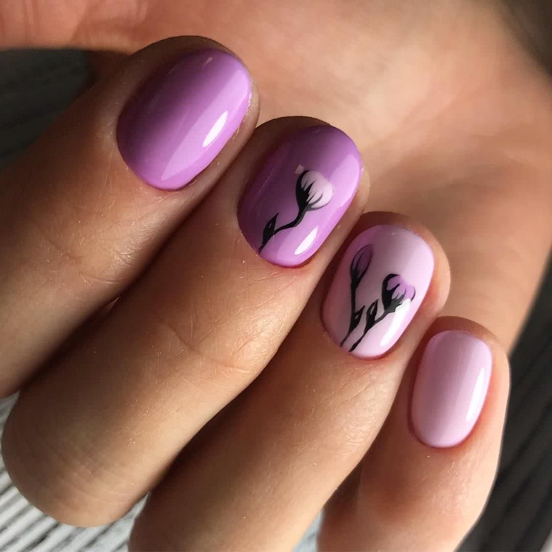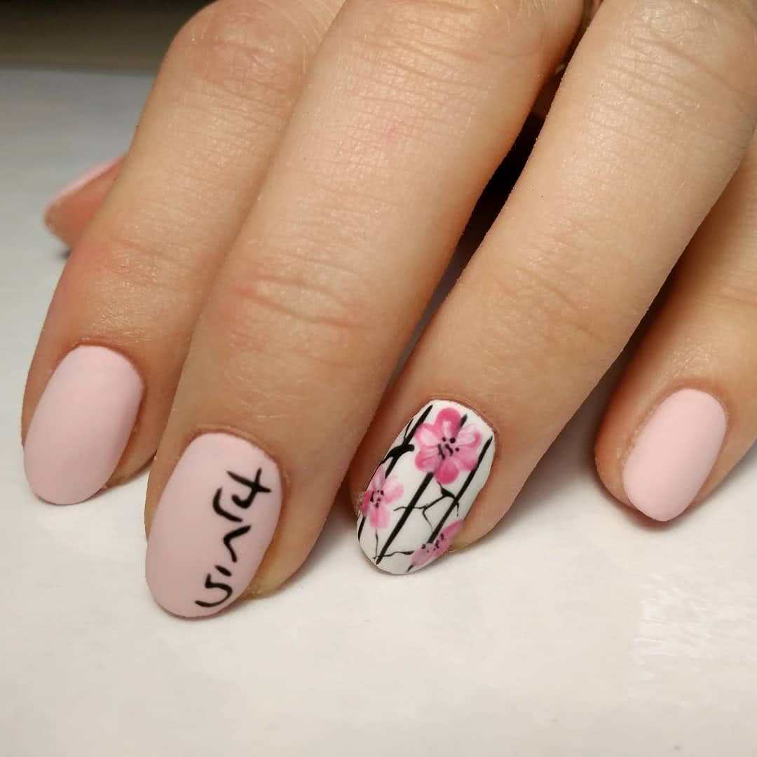 Для лаконичного нейл-арта можно покрыть ногти молочно-розовым оттенком. Указательный и средний пальцы сделать матовыми. На них же разместить парный рисунок нежной веточки, выполненный черным или синим лаком. Получится очень стильно, если ветка будет как-бы скользить по ногтям, спускаясь по бокам с кончика одного ногтя к лунке другого.