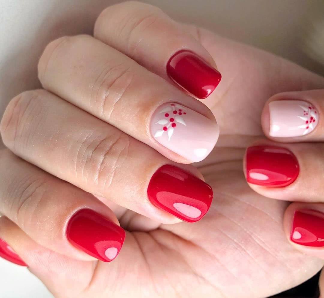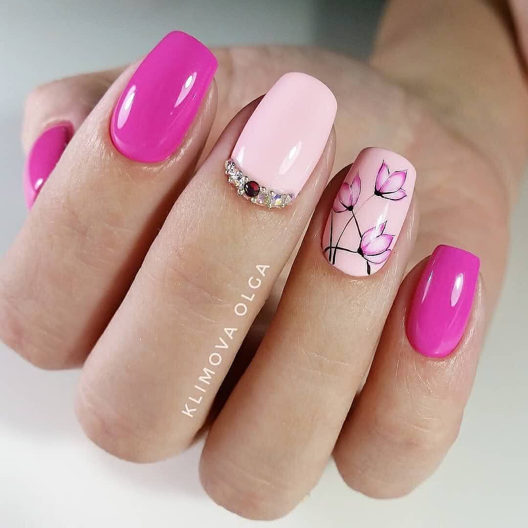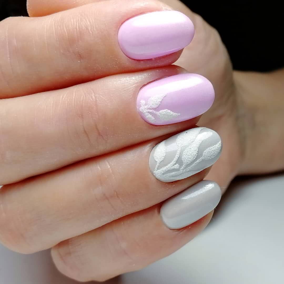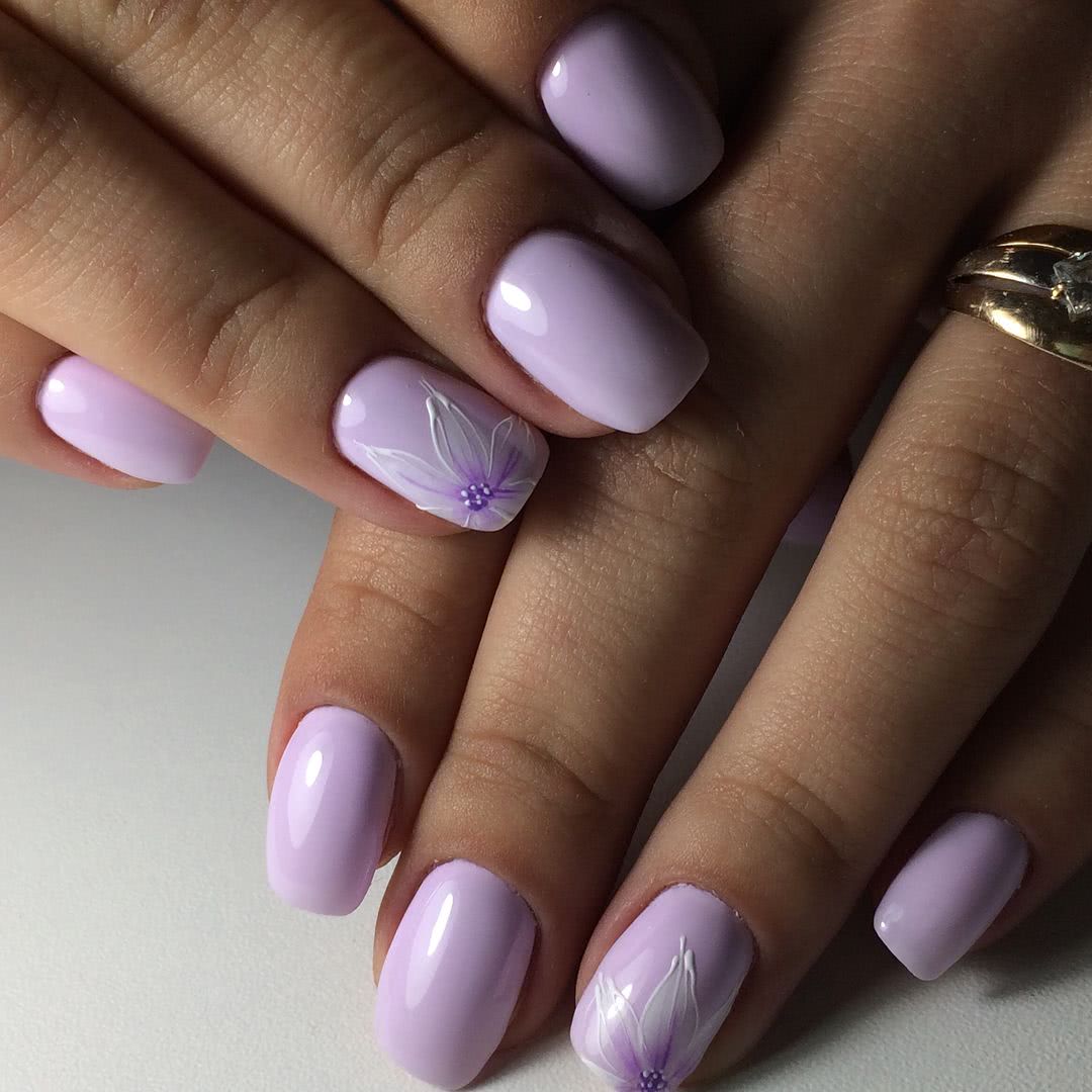 Для лаконичного нейл-арта можно покрыть ногти молочно-розовым оттенком. Указательный и средний пальцы сделать матовыми. На них же разместить парный рисунок нежной веточки, выполненный черным или синим лаком. Получится очень стильно, если ветка будет как-бы скользить по ногтям, спускаясь по бокам с кончика одного ногтя к лунке другого.