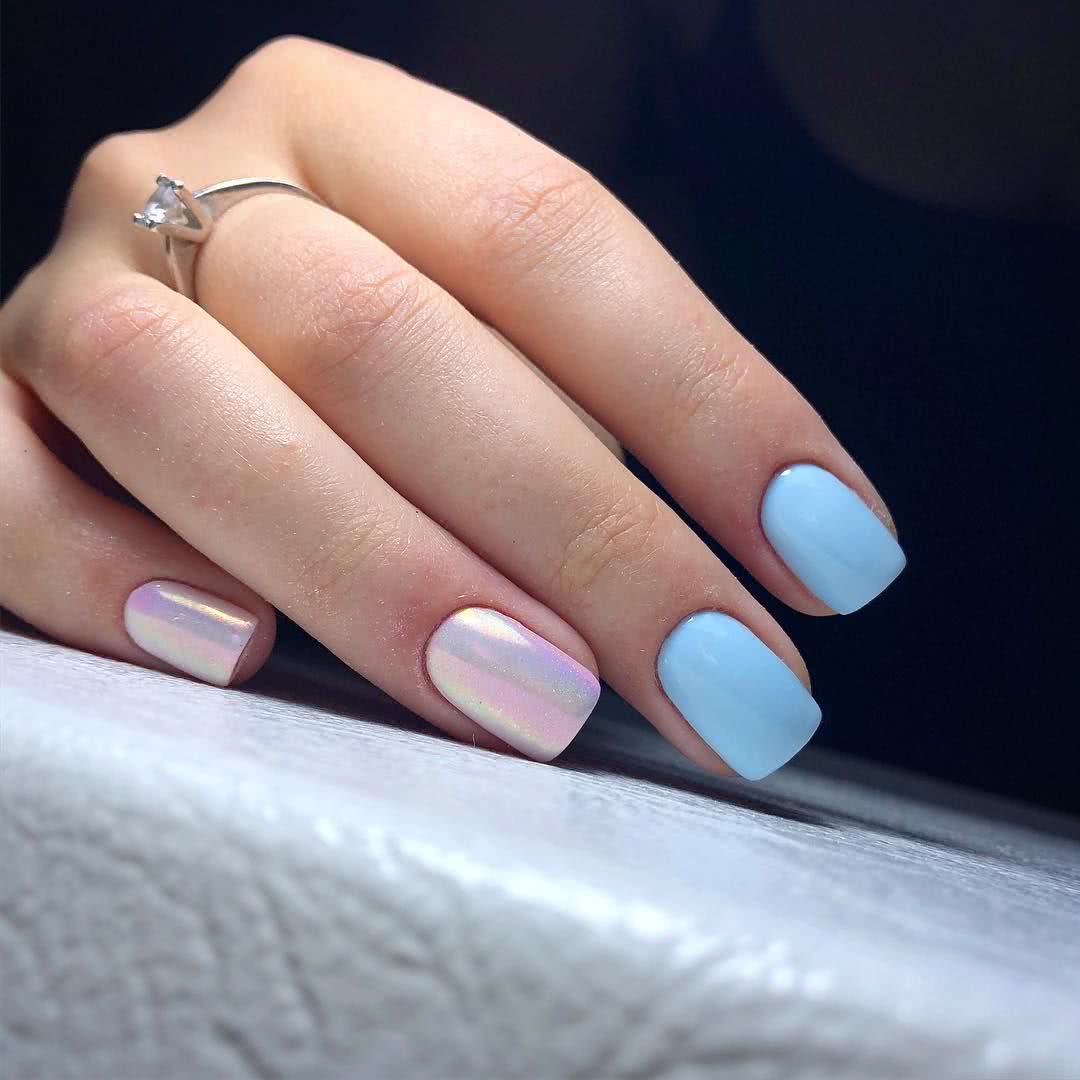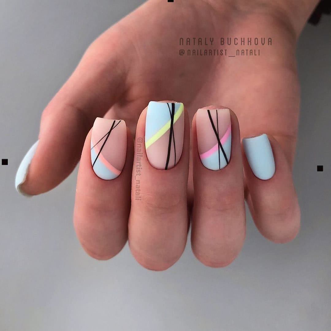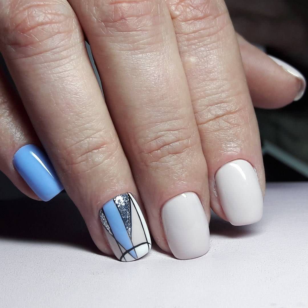Еще одна новая идея для коротких ногтей квадратной или овальной формы – сочетание negative space c геометрией. Тонкие линии, хаотично размещенные на ногтях, окрашенные в бледно-голубой цвет треугольники и оставленные неокрашенными части поверхности ногтя сделают дизайн невероятно стильным.