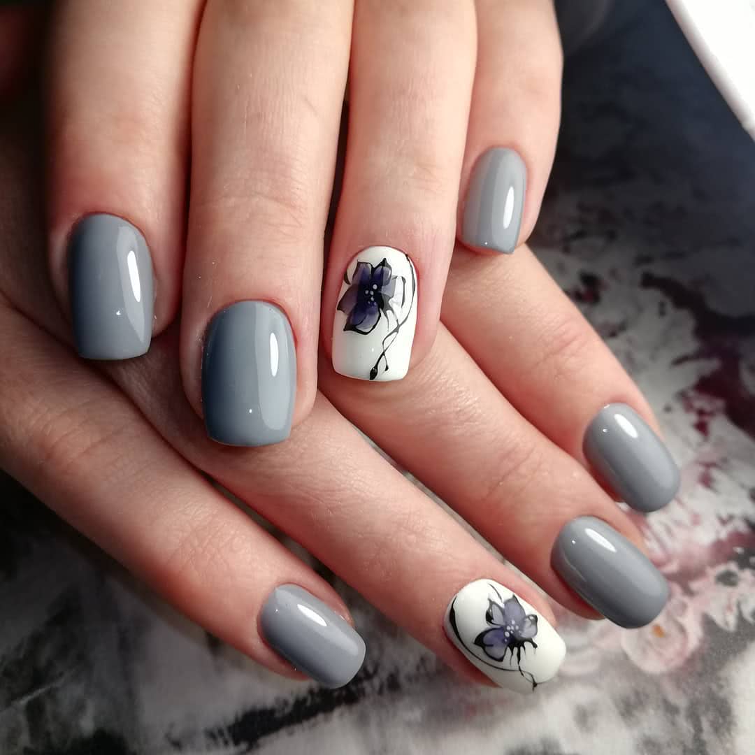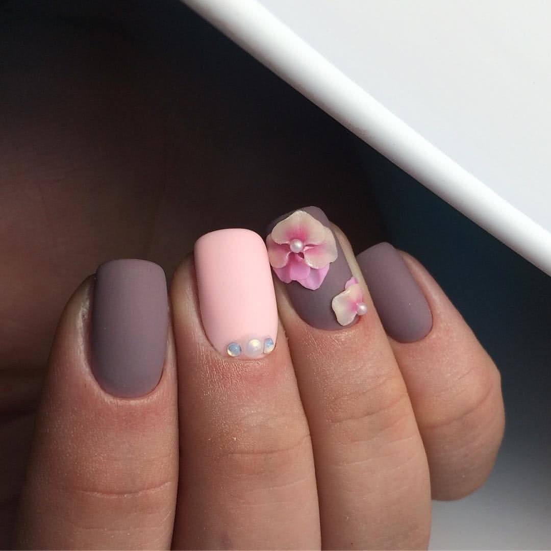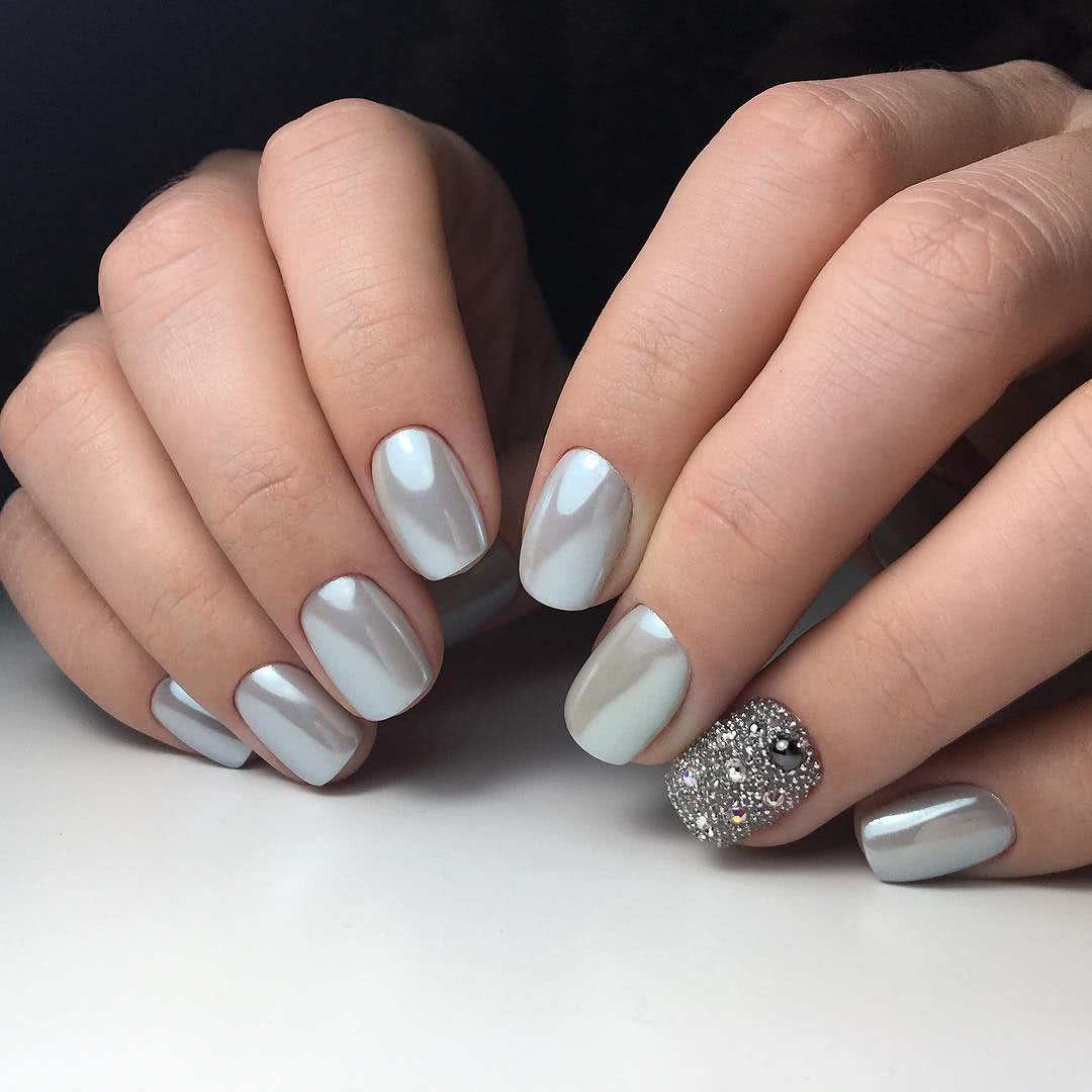 Пастельный маникюр на коротких ногтях в сером цвете позволит подчеркнуть индивидуальность стиля. В этом сезоне стилисты предлагают использовать матовое покрытие. Оно смотрится эффектно, необычно и элегантно. Если вы собрались на светский раут, добавьте к такому покрытию немного блеска и вы получите роскошный дизайн, который подойдет к любому вечернему наряду.