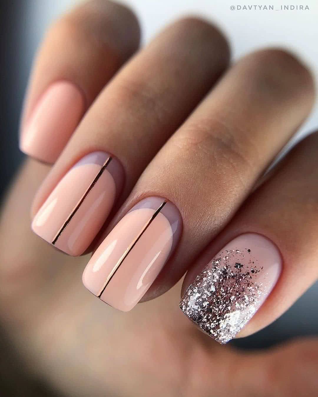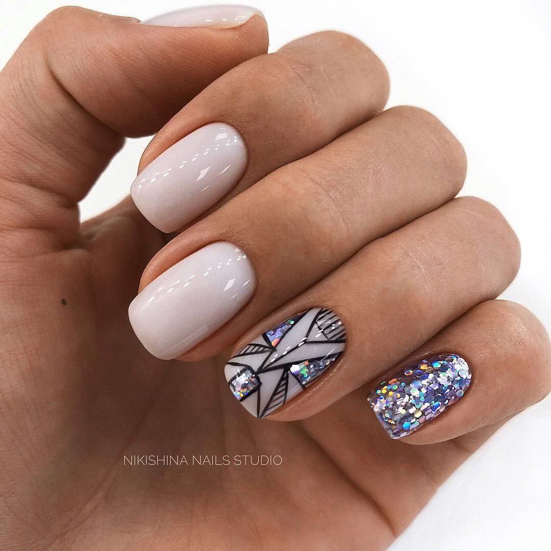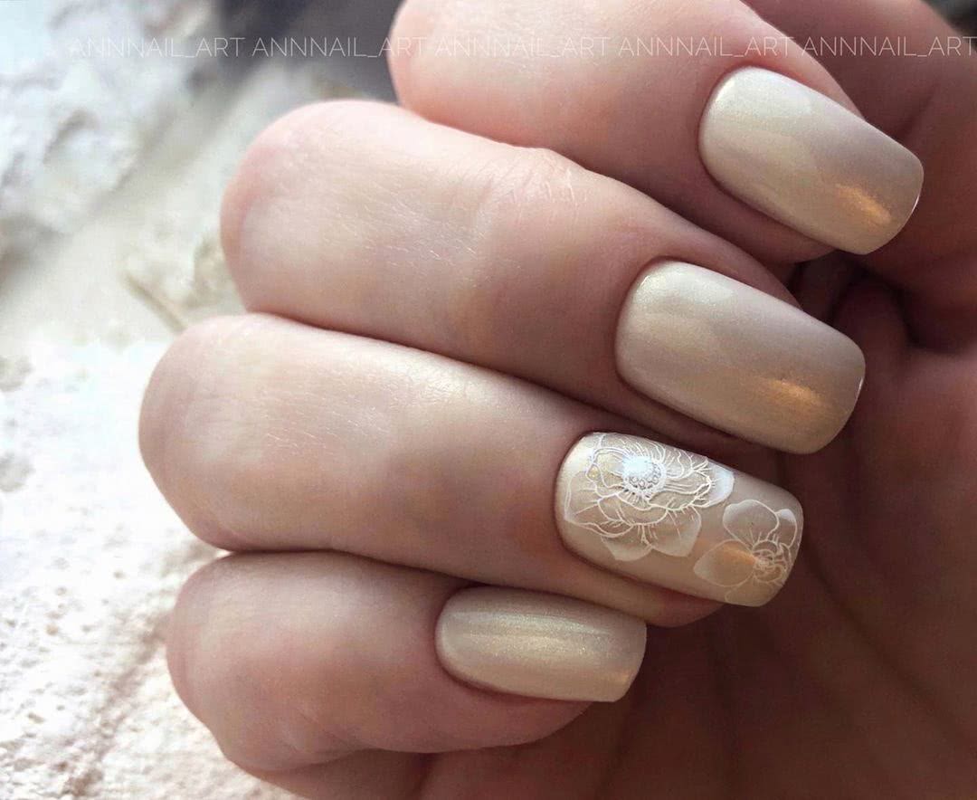 Для повседневных луков можно дополнить молочно-сливочное покрытие эффектом «битого стекла» на безымянном и среднем пальцах. Также можно сделать оттиски фольги или выделить линию «улыбки» тонкой металлизированной полоской.
