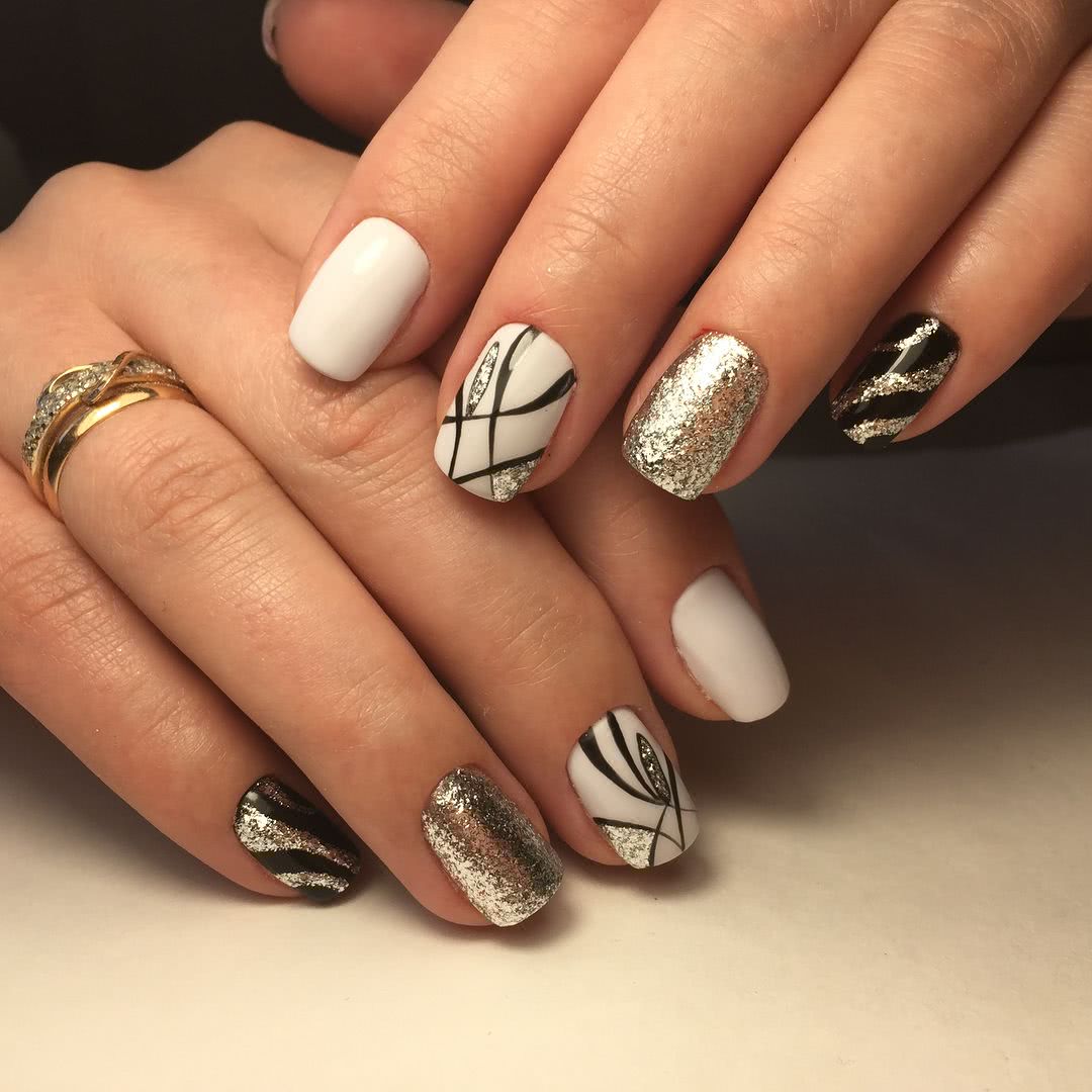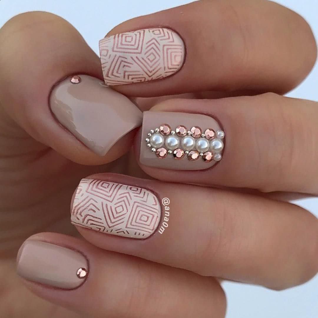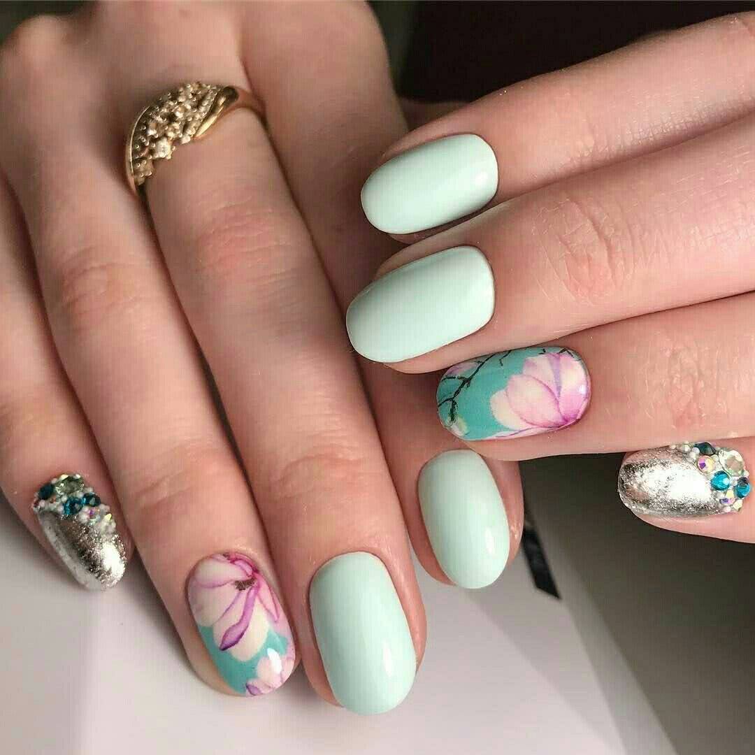 Блестки, шиммер и глиттер позволяет добавить яркости любого дизайну. То же самое касается страз, бусин и декоративных камней. В сочетании с нежным оформлением ногти будут смотреться особенно красиво и даже роскошно. Поэтому рекомендуем применять данный декор к цветочному рисунку. В свою очередь, фольгированные детали чаще комбинируют с геометрическим или градиентным оформлением. Но помните, что основное покрытие все же лучше делать нейтральным или пастельным.