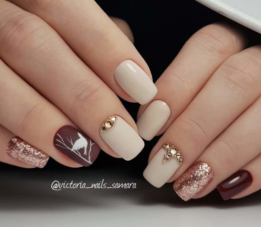 На пике популярности в ногтевой индустрии сейчас дизайн «битое стекло». Чтобы создать такой шедевр, на ноготки накладывают кусочки голографической фольги. Очень популярными для такого маникюра считаются такие цвета, как лавандовый, розовый, фиалковый, кварцевый. Также можно использовать прозрачное бесцветное покрытие. Очень модные сейчас кофейные оттенки и тона тёплого молока.