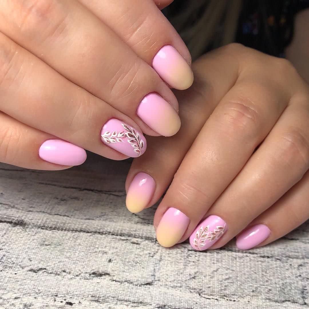 Отличным вариантом станет линейное омбре с пастельными тонами. Такую расцветку можно не дополнять другими эффектами. Линейное омбре выполняется как на всех ногтях, так и только на нескольких. При этом остальные покрываются одним из использованных для градиента лаков.