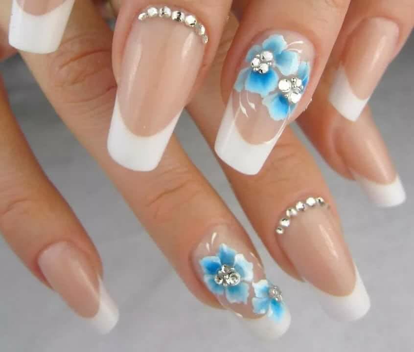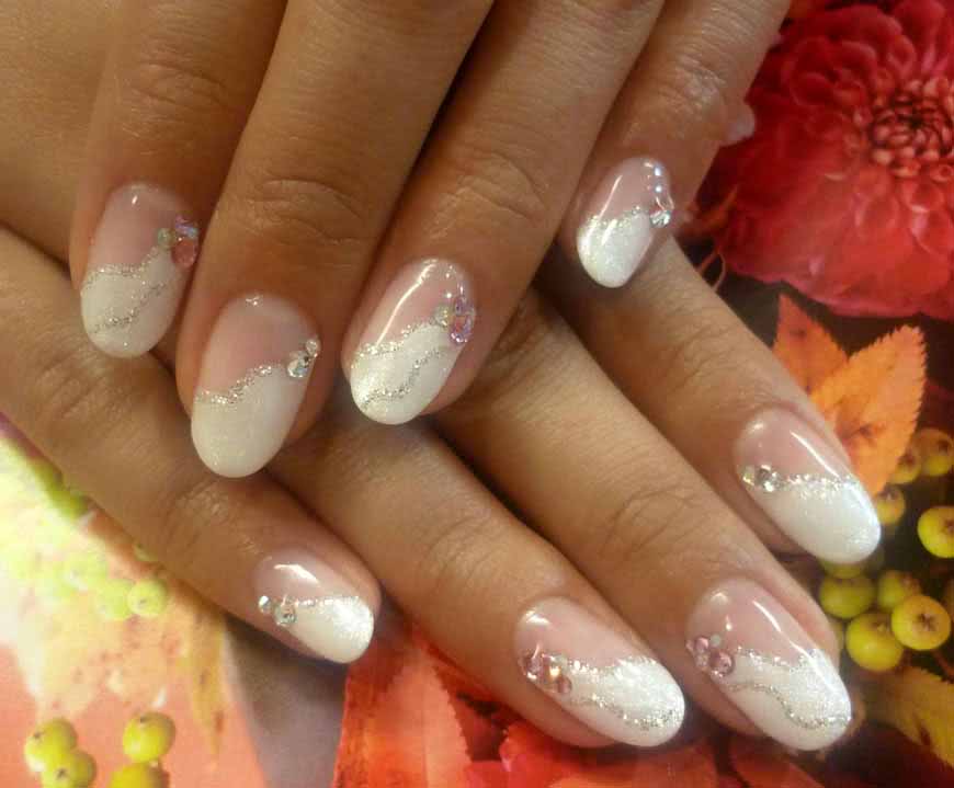 Белый цвет отлично сочетается со стразами. Мелкие камни можно располагать в произвольном порядке или делать с их помощью определенную композицию.