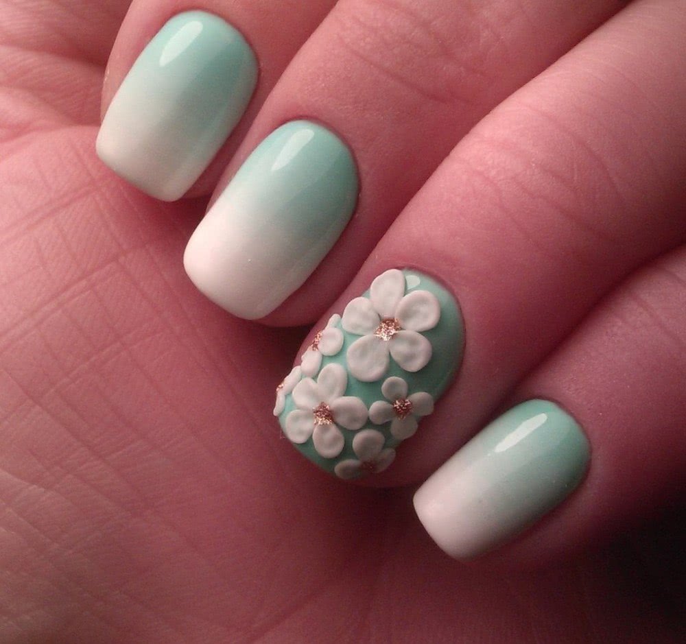 Поэкспериментируйте с гаммой оттенков при монохромном покрытии или омбре. Для нежного маникюра подходят не только розовый или кремовый цвета. Красиво выглядят на ноготках оттенки мяты, персиковый, лавандовый, голубой и другие тона. Весной и летом отлично смотрятся мятный и бирюзовый цвета, которые напоминают нам нежную листву молодых деревьев. Для зимнего маникюра подойдут голубые и белые тона, благодаря которым выходят шикарные снежные орнаменты.