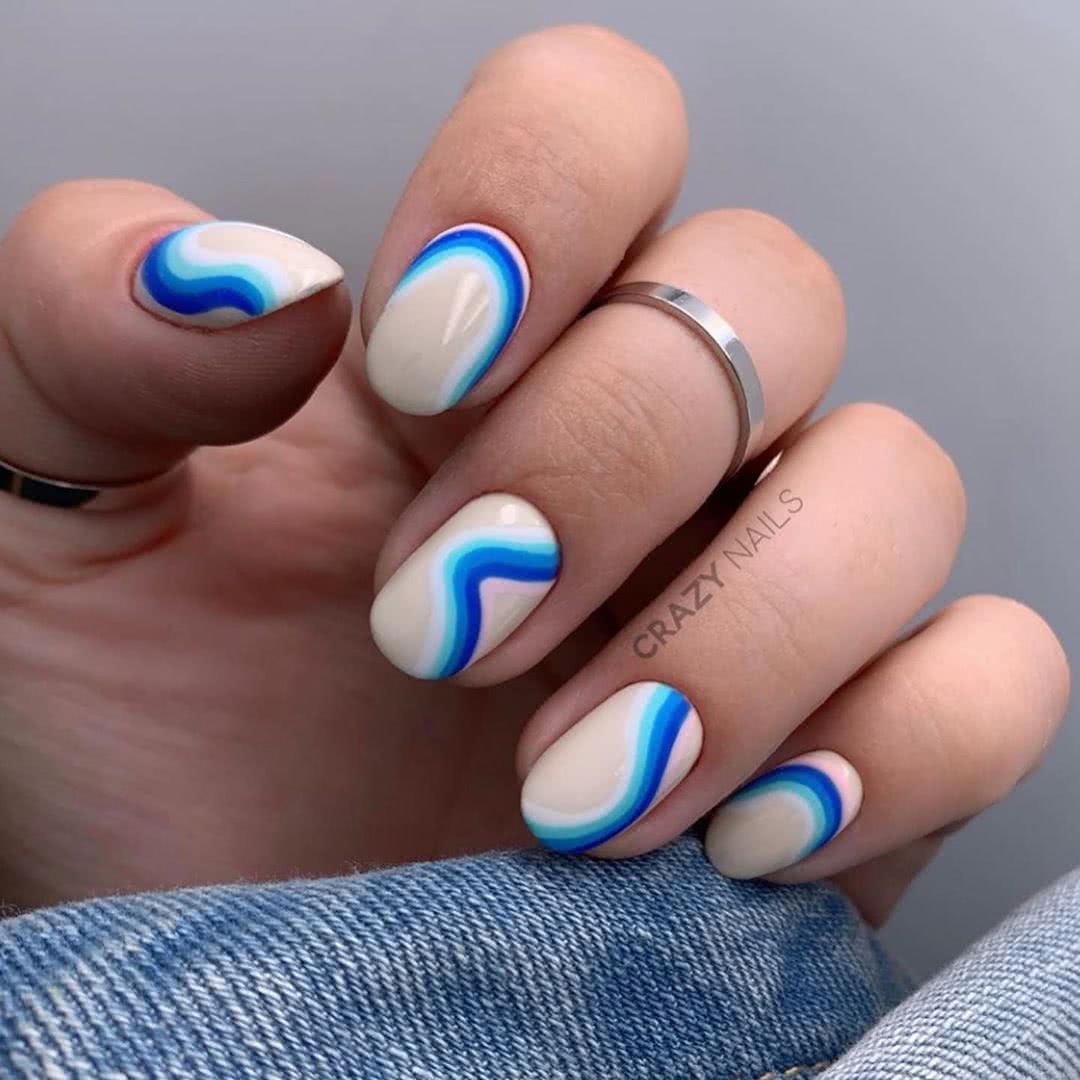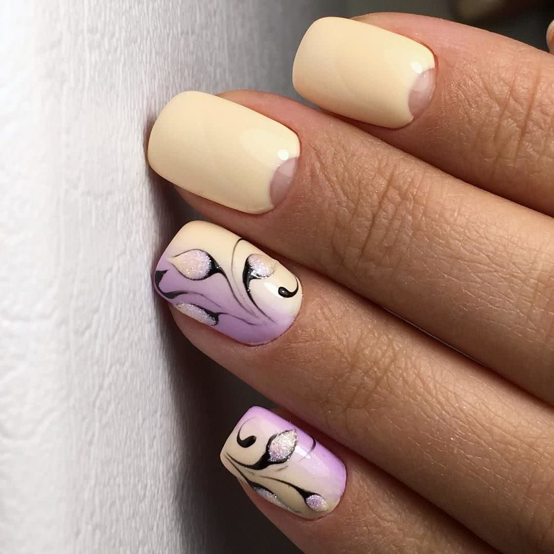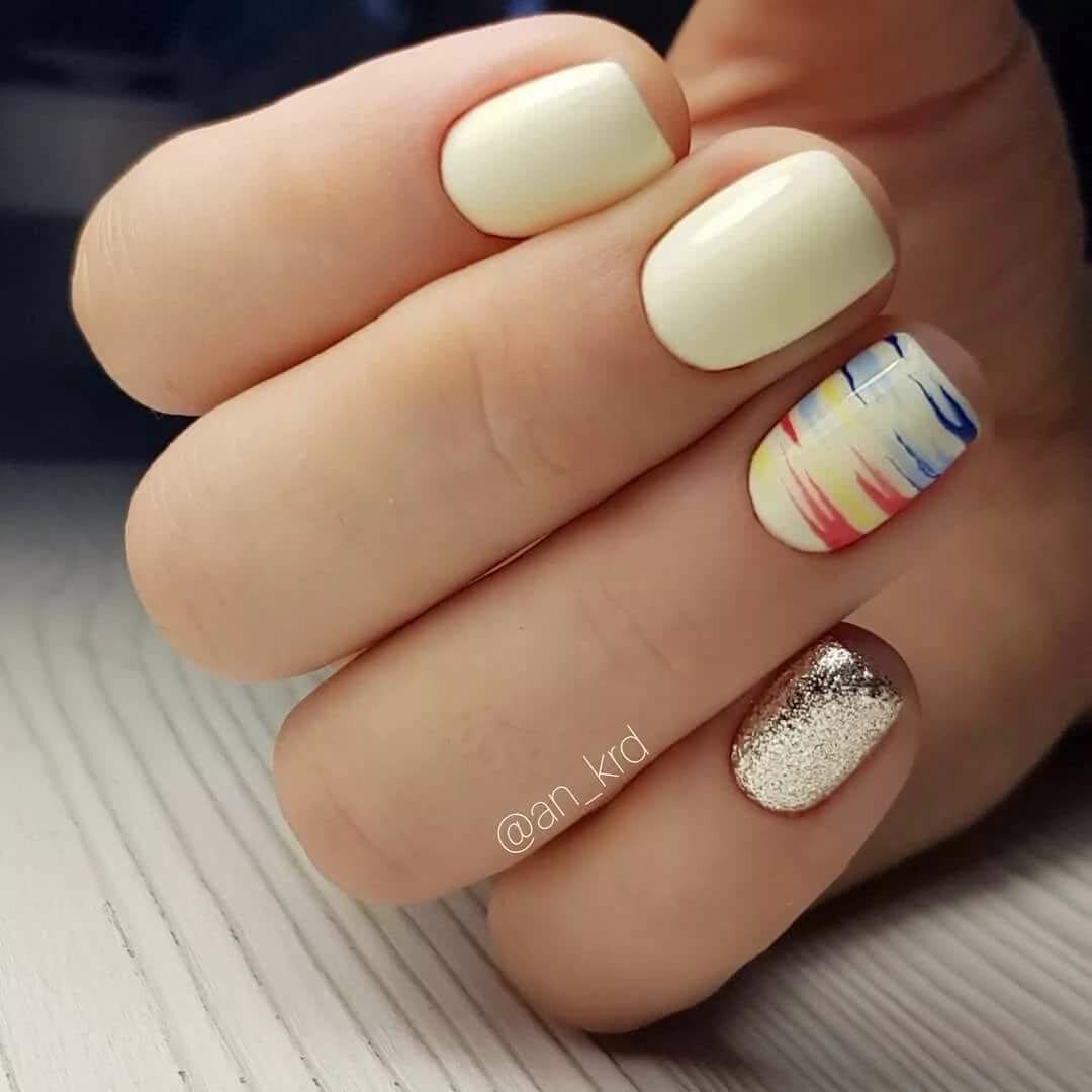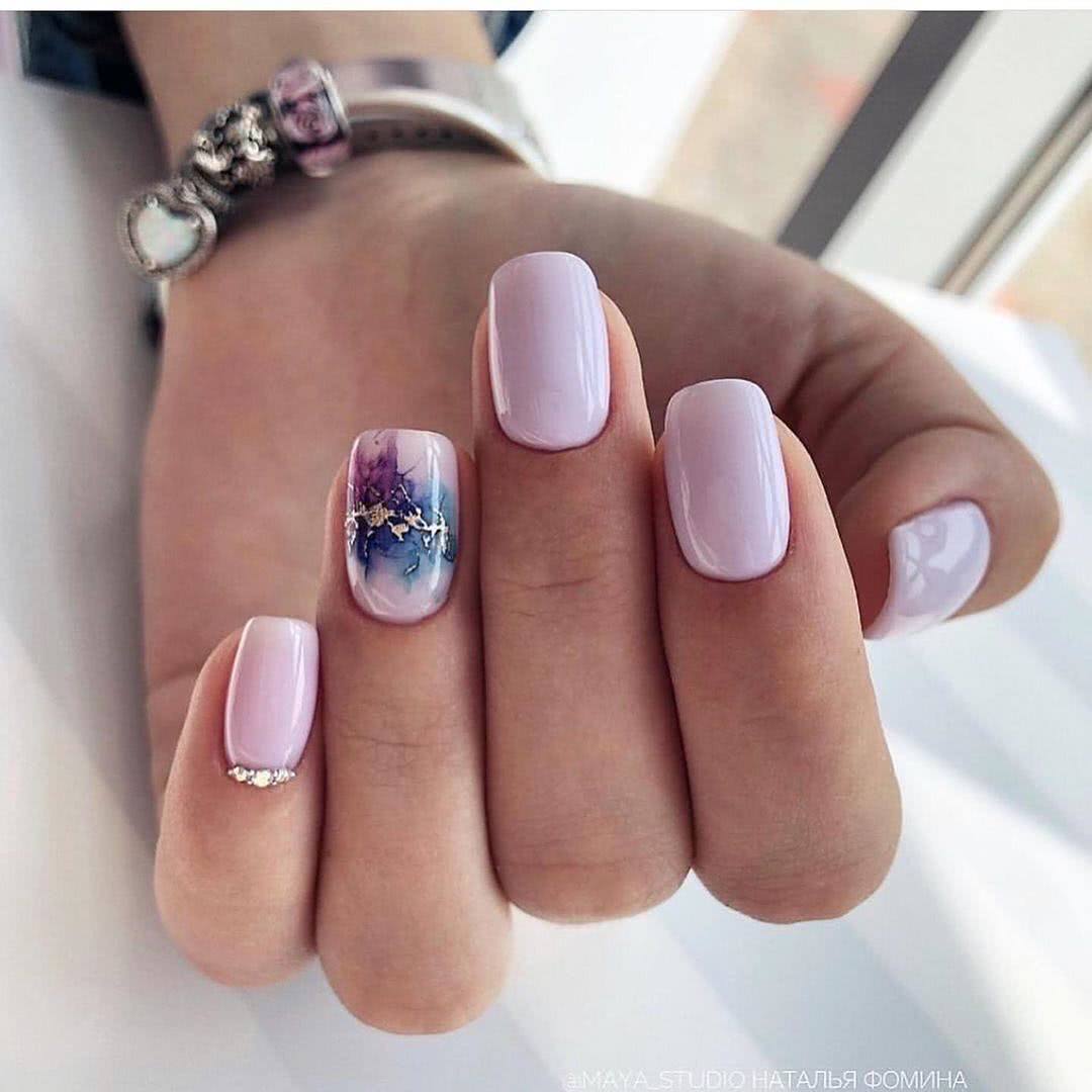 Абстрактные мазки пастельных тонов по всей поверхности ногтей отлично украсят короткую длину. Можно использовать бледно-синий, светло-желтый и нежно-розовый цвета. Такой дизайн лучше не сочетать с блестками или фольгой.