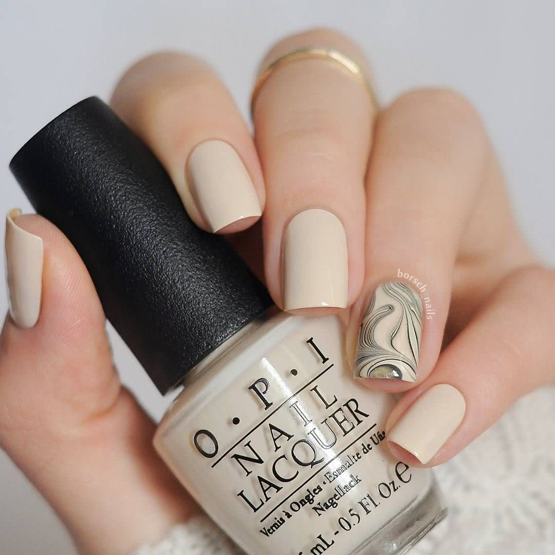 Универсальным и практичным оттенком считается бежевый цвет. Он отлично смотрится на ногтях любой длины. Если хочется разбавить однотонное покрытие, то можно использовать различные модные техники. Так, согласно модным тенденциям на пике популярности мраморный эффект. Стильно смотрится дизайн с использованием графических рисунков, геометрических фигур. Причем, они могут украшать только 1-2 пальчика. В этом случае они не перегрузят задуманный нежный дизайн и при этом придадут оформлению особую колоритность. Несмотря на нейтральность бежевого цвета, при выборе различных оттенков для нежного маникюра, можно создать эффект омбре, который также очень популярен в настоящее время.