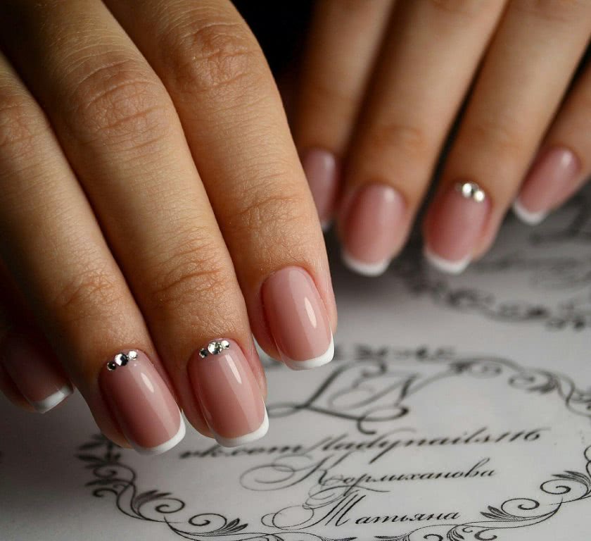 На коротких ногтях шикарно смотрится французский маникюр со стразами. Выделенный край ногтевой пластины позволяет визуально вытянуть ноготки, а стразы в прикорневой зоне придадут френчу эффектные и яркие нотки. Используйте на коротких ногтях гель-лаки нежно-розового, молочного, бежевого, миндального, лилового и другим мягких оттенков.