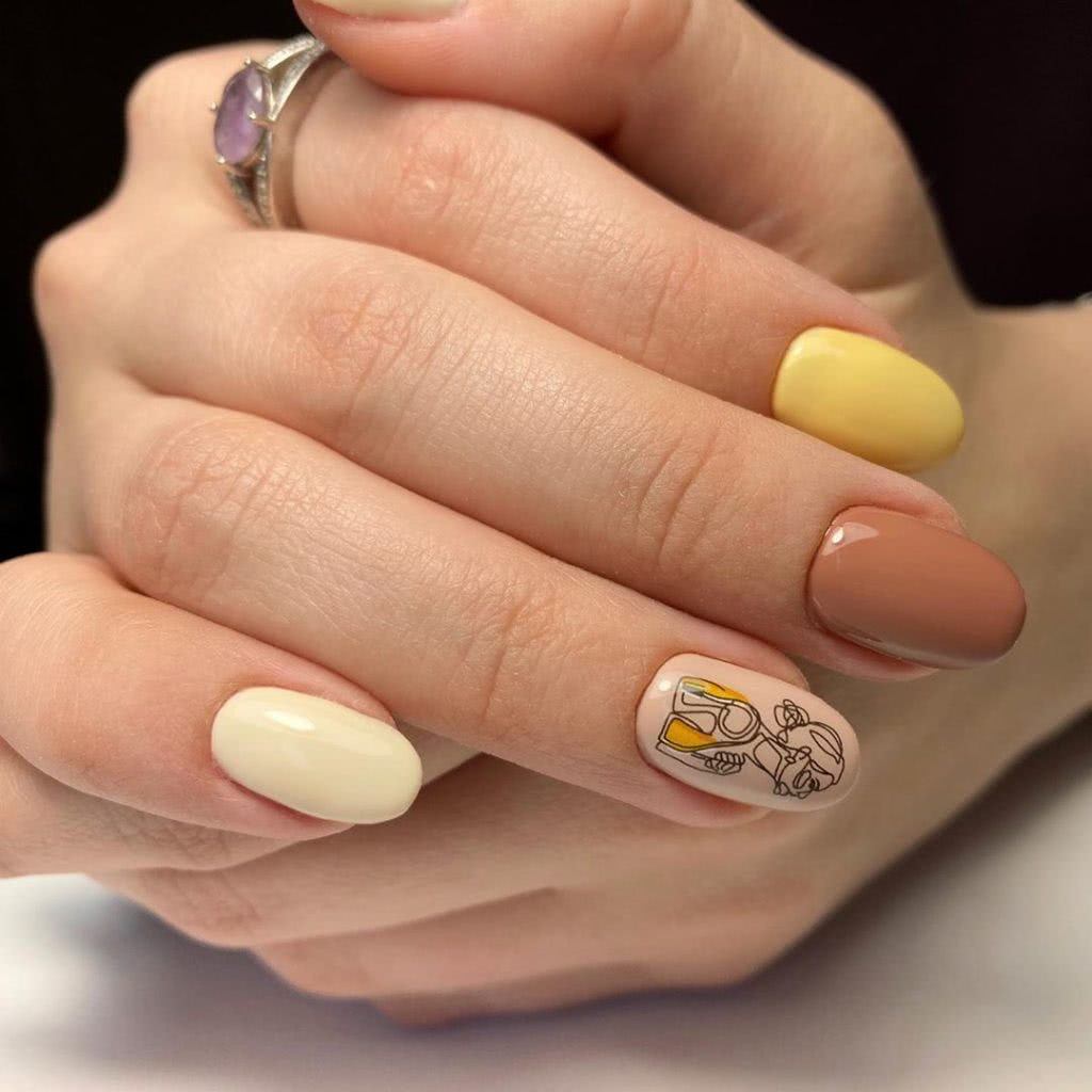 Невероятно красивой и популярной альтернативой молочному цвету смело называем маникюр в нейтральных коричневых тонах: бежевый, экрю, цвета кофе, охры и другие. В дизайне ногтей оттенки коричневого красиво согласовываются в технике омбре, когда цвета переходят с одного пальчика на другой (фото).