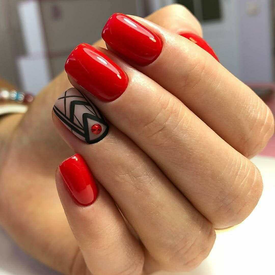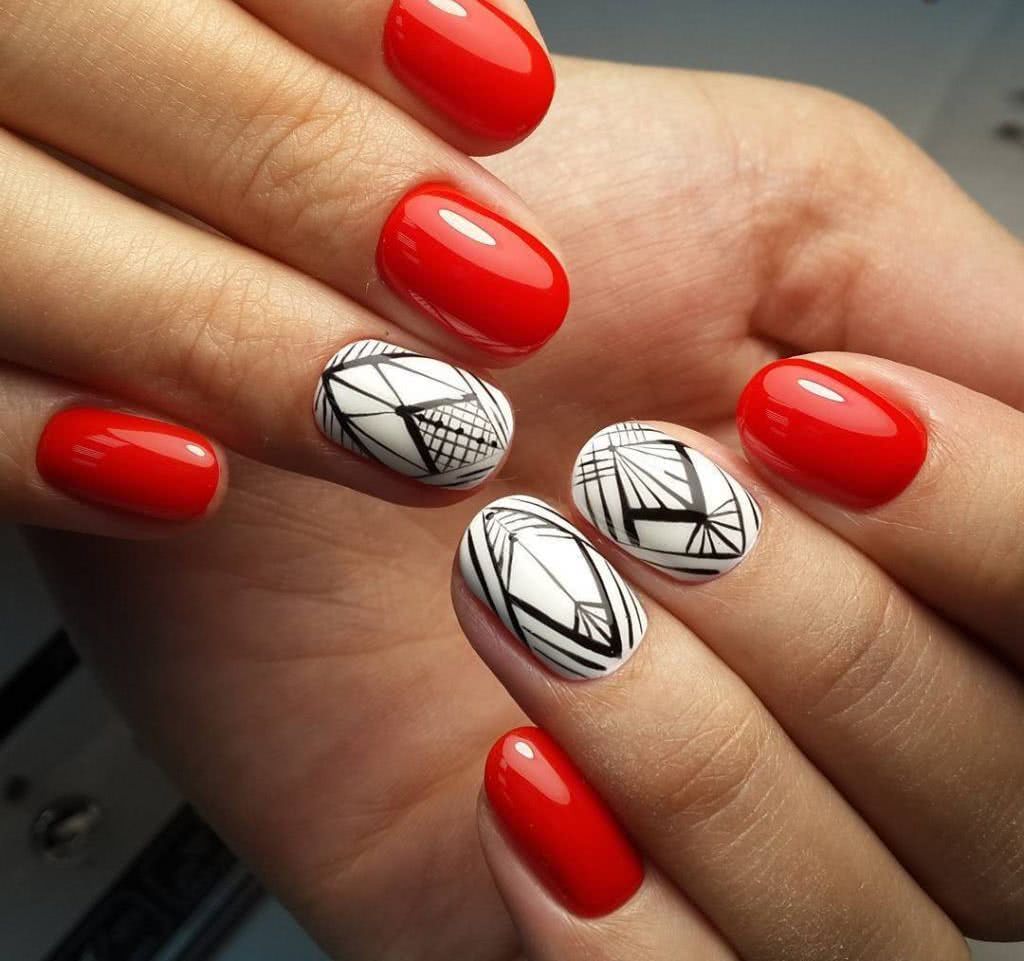 - геометрия – такой сдержанный цвет как красный и его многочисленные оттенки нуждаются в строгих и лаконичных узорах. Геометрия в белом, черном и других оттенках станет лучшим дополнением алого, бордового, вишневого маникюра.