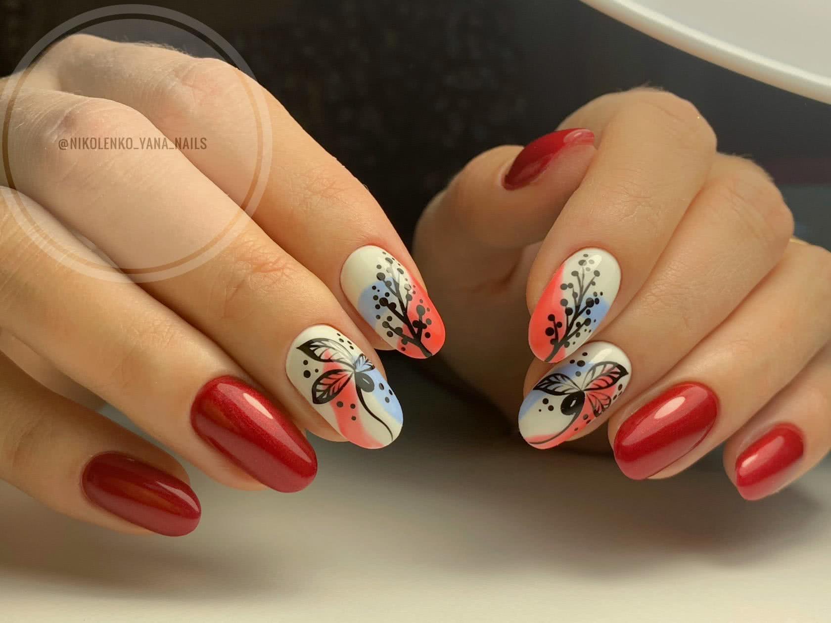#4 Красный маникюр с флористикой 2020