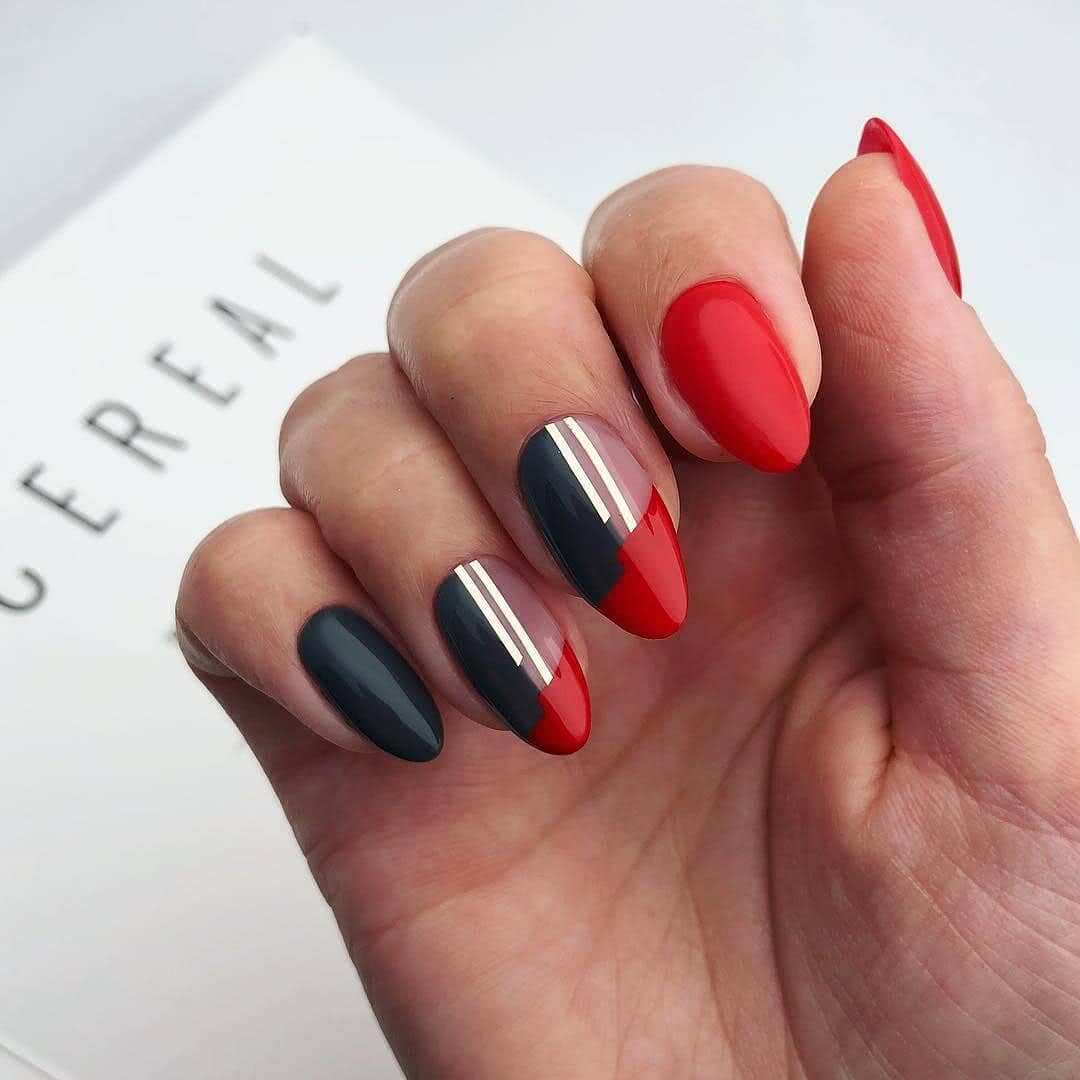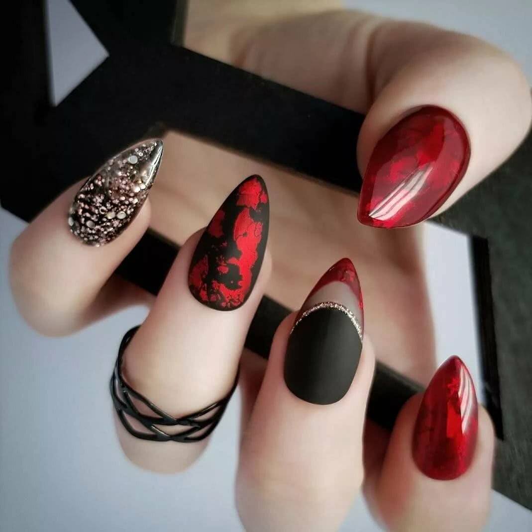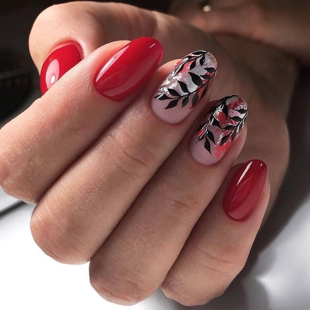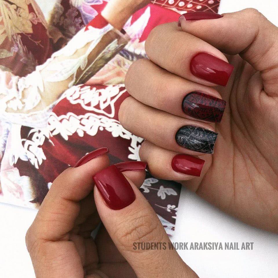 Сочетание двух строгих, выразительных цветов красного и черного на ногтях смотрится броско. Современные нейл мастера для создания неповторимого дизайна играют с палитрой, используя разные техники. Это градиент, кружево, «negative space», «color block» или строгая геометрия. Каждая из них актуальна в этом году. Для украшения подойдет битое стекло, камифубуки или фольга.