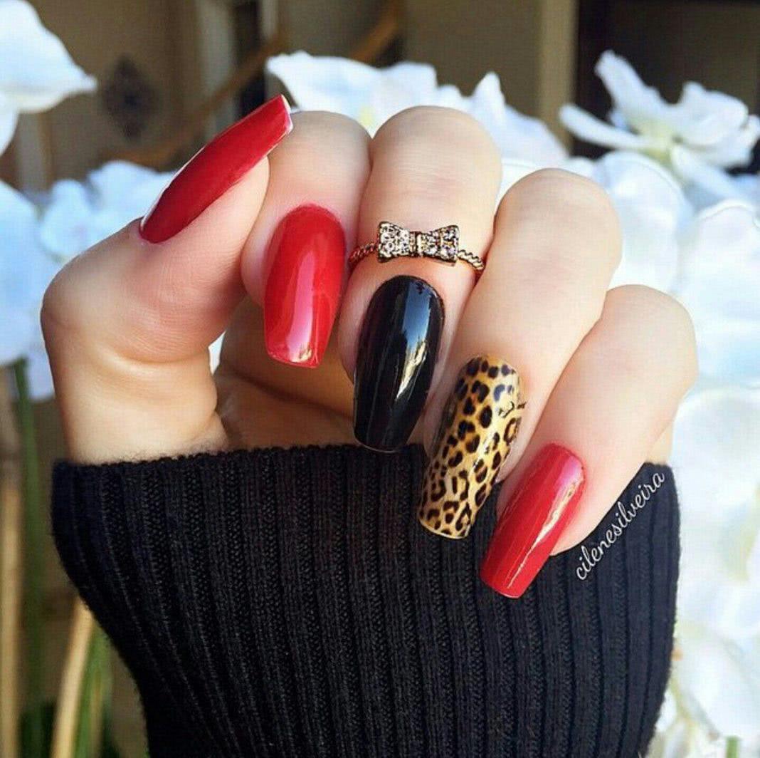 Маникюр, в котором сочетаются красный и чёрный цвет очень популярен среди модниц. Такой дизайн может быть повседневным и сдержанным или подобранным специально для определённого события и наряда. При этом, использование красного подразумевает большую вариацию оттенков от алого, до земляничного или кораллового. Ваши ручки с такими ноготками никогда не останутся без внимания!