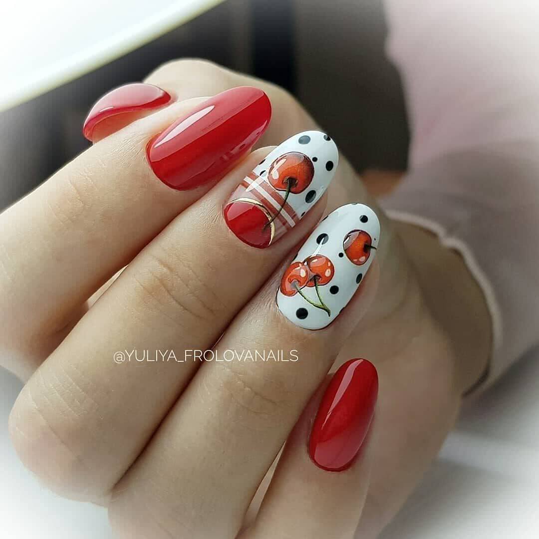 Сладкая, сочная вишня является популярным рисунком на одежде и ногтях. Это потому, что она яркая, свежая и придает вашему стилю красный оттенок. Нанесите символическую двойную вишню на каждый ноготь, чтобы получить восхитительный результат, который напомнит о долгих летних днях. Сочетайте этот дизайн с классическим французским маникюром для еще более восхитительного дизайна ваших ногтей.