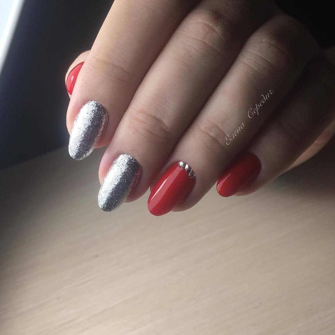 Самое простое и одновременно привлекательное решение – это чередование красного и серебряного цвета. Маникюр выглядит сдержанно, отлично впишется в деловой, повседневный образ. Интересны варианты, где глиттер используется для выделения края ногтевой пластины или прикорневой зоны. Глиттер также можно использовать для выделения геометрического дизайна.