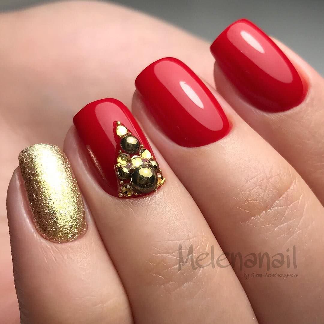 Сочетание красного и золотого цвета – эталон торжественного нейл-арта. Не стоит экспериментировать со сложным дизайном. Достаточно будет слегка посыпать прикорневую зону золотыми блестками. Отлично смотрится геометрический дизайн с полосками, выделенными золотым глиттером.