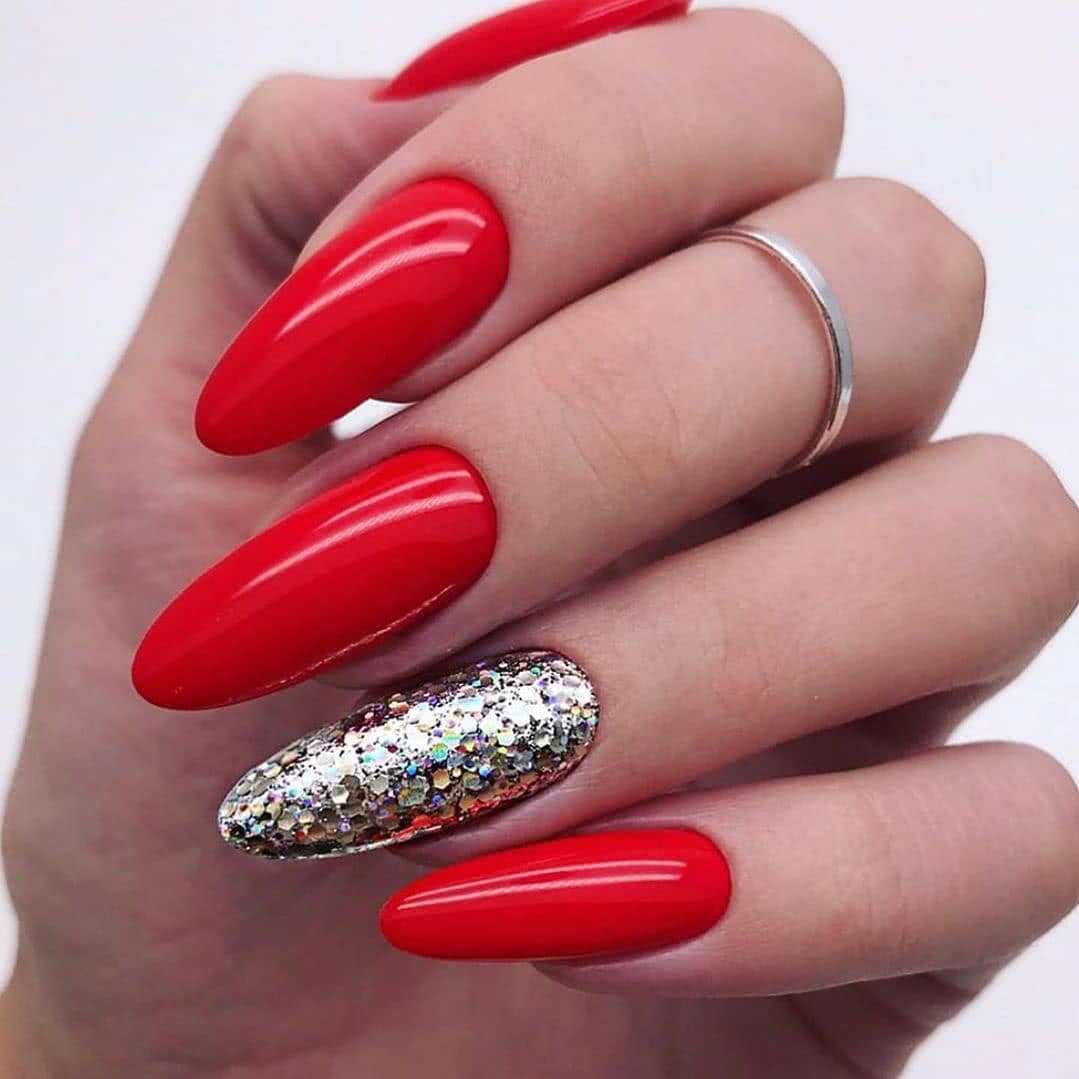 #2 Красный маникюр с серебряным и золотым глиттером 2020