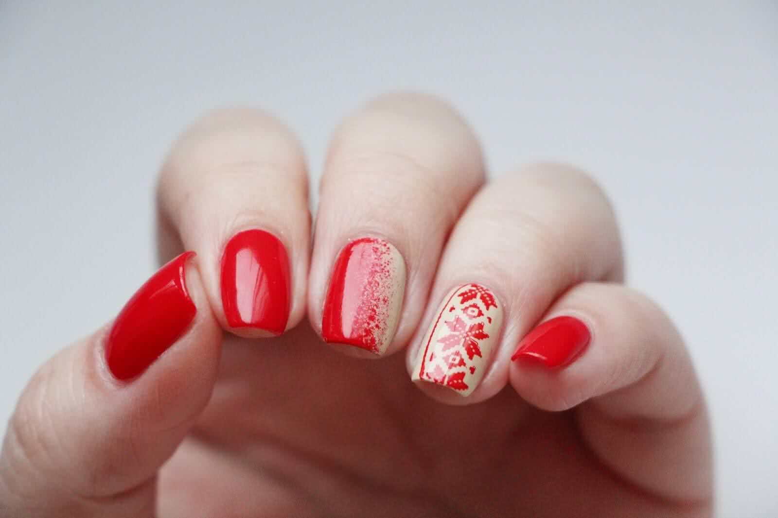 Стемпинг. Этот вид маникюра заключается в нанесении рисунка с помощью специальных дисков. Хорошо будет выглядеть как красный на белом, так и белый на красном.
